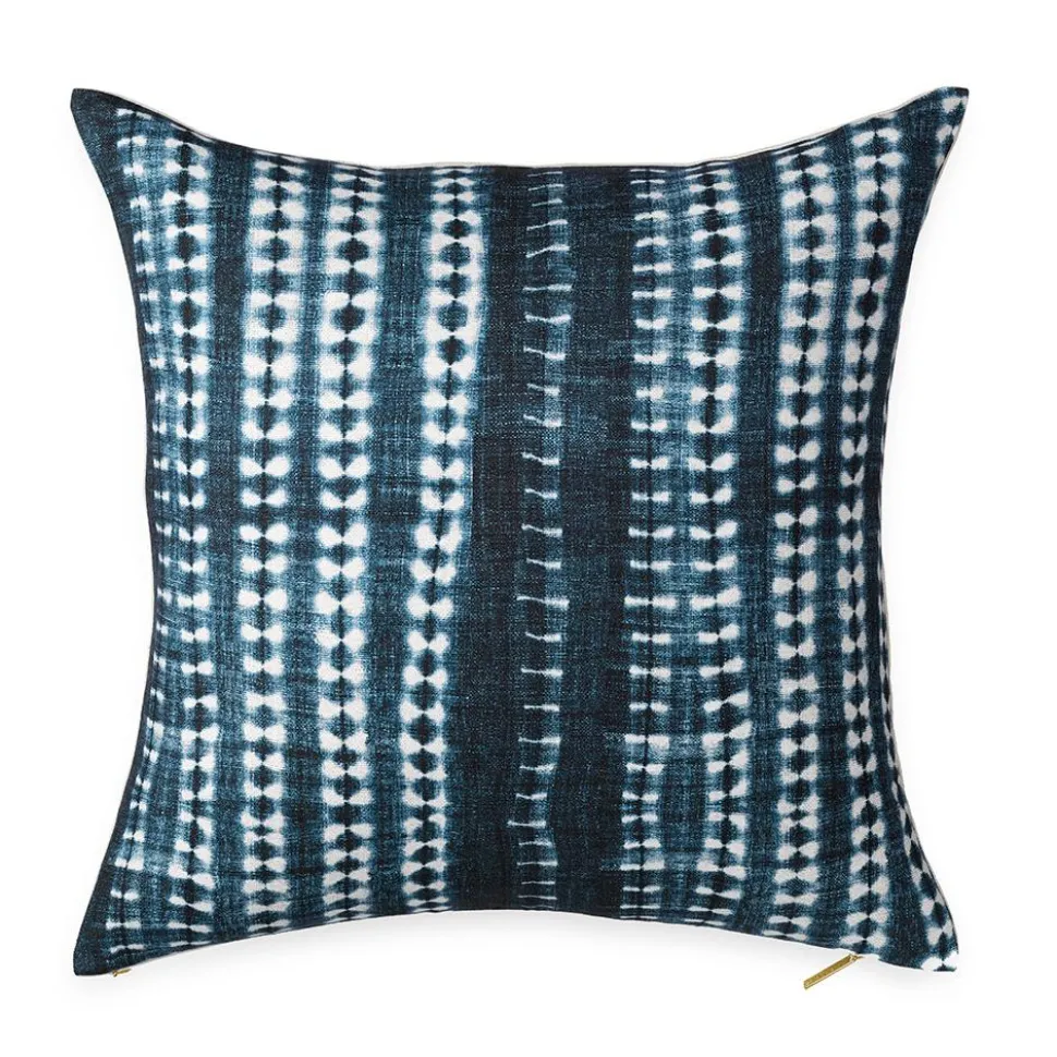 Belgian linen and cotton. Indigo dyeing process. Finished with our flax linen backing and closed by an exposed zipper with a gold pull. The cushion is stuffed with an oversized down insert. Printed in the USA.