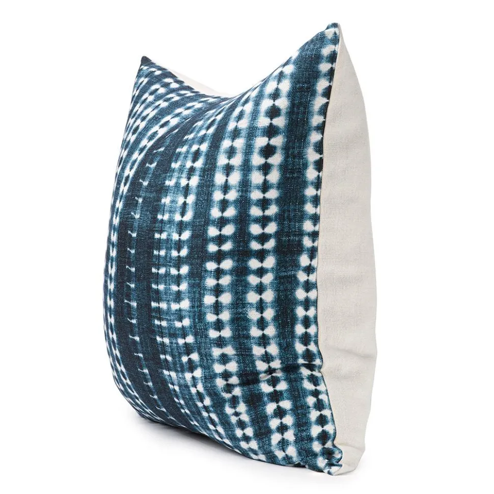 This pillow is made from fabric inspired by the Indigo textile. The indigo color, or “gold blue,” is a symbol of the link between heaven and earth. Dye vats take a full week to prepare and require daily stirring. The un-dyed cloth is pinched, sewn, and tied according to precise patterns. Once the dye is applied to the material, the ties are removed, revealing patterns of lines, shells, dots, or tracery.