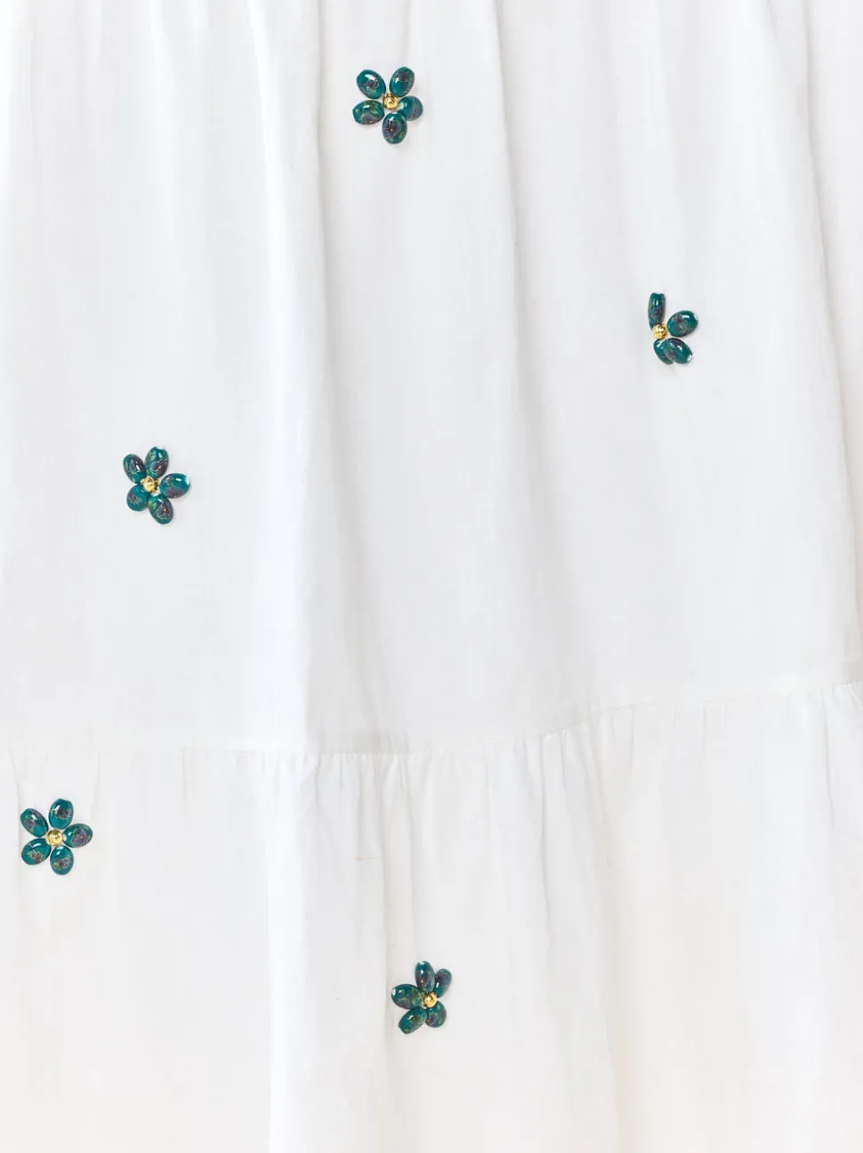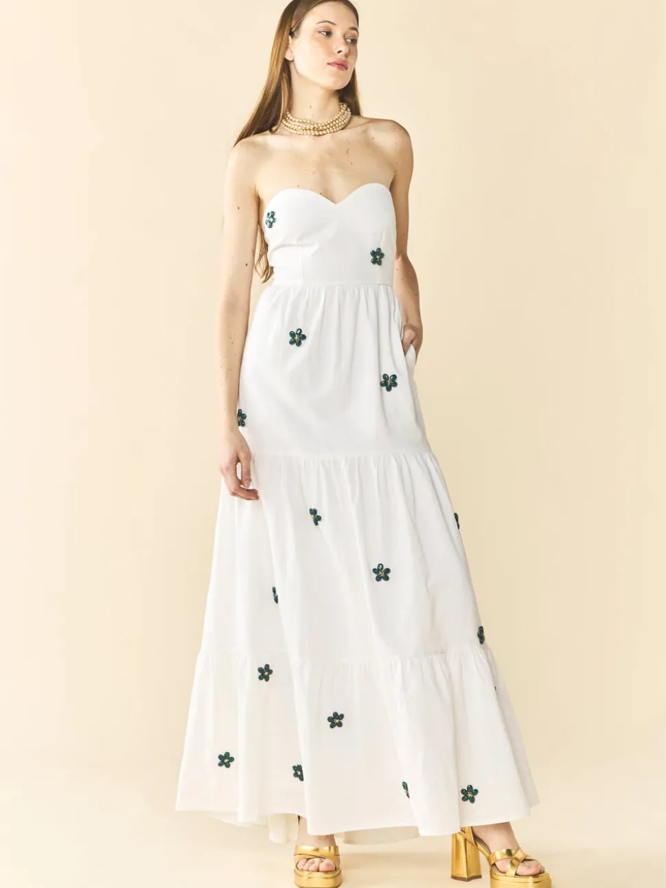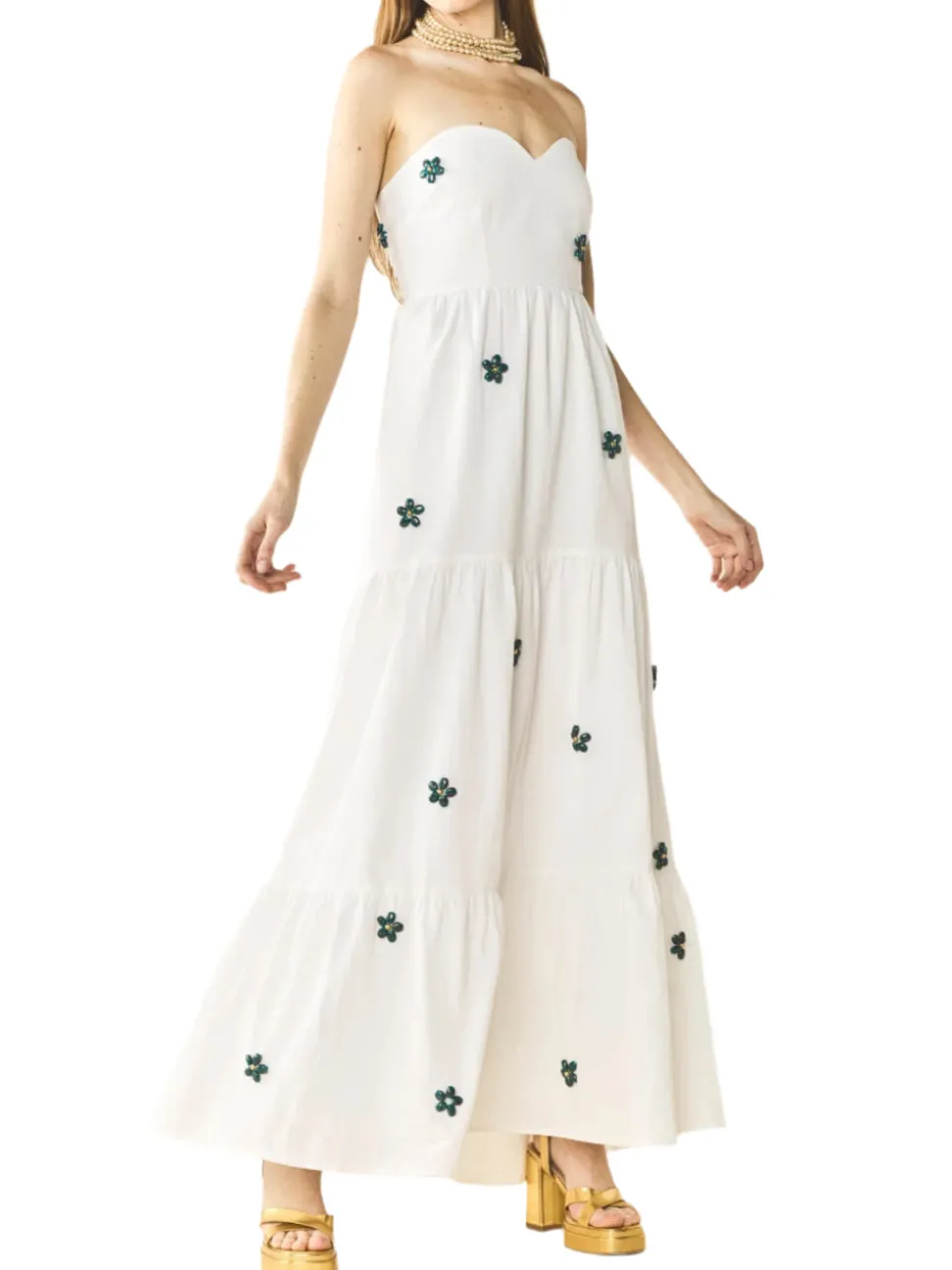 70% cotton, 30% linen. Strapless silhouette. Sweetheart neckline. Hand-painted beaded floral embellishments. Tiered, full-length skirt. Lightweight and breathable fabric.