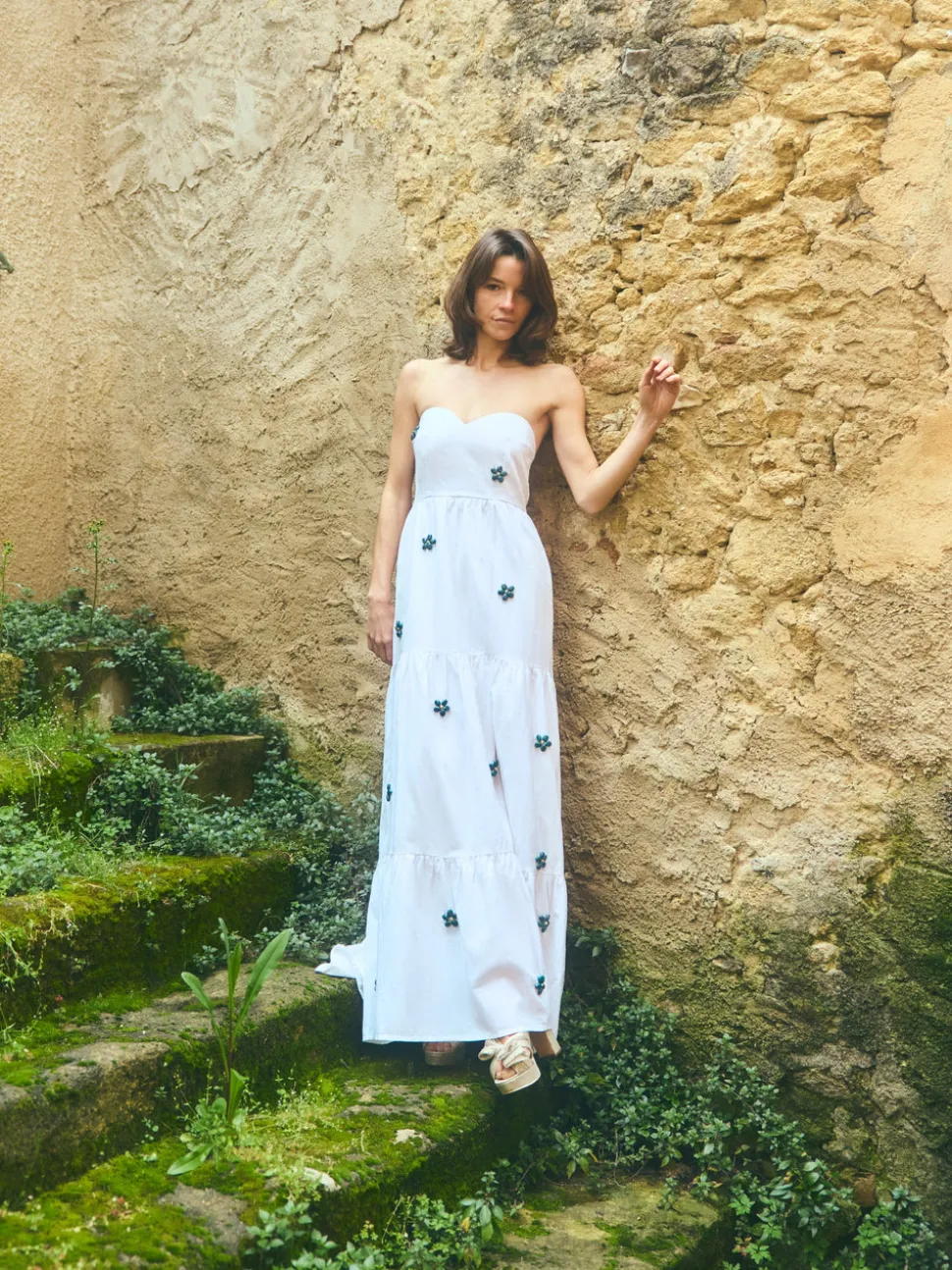 Tomboy looks, girly-girl styles, and an always fashionable approach define EDDY’s aesthetic. With a focus on bold and feminine silhouettes, EDDY dresses and tops pair elevated California bohemian with global inspiration; these are clothes designed to make you feel good inside and out. The Days Gown in White with Painted Beads is crafted from a breathable cotton-linen blend and designed with a strapless silhouette and sweetheart neckline. Hand-placed painted beaded florals bring texture and artisanal charm to its tiered, full-length form—made to float through warm days and golden-hour gatherings alike.