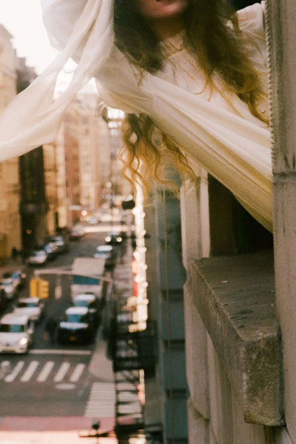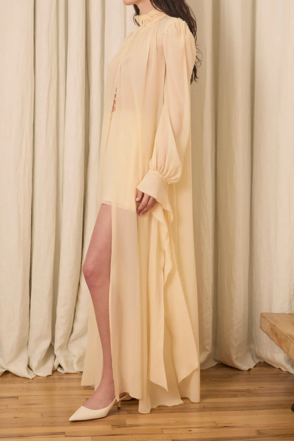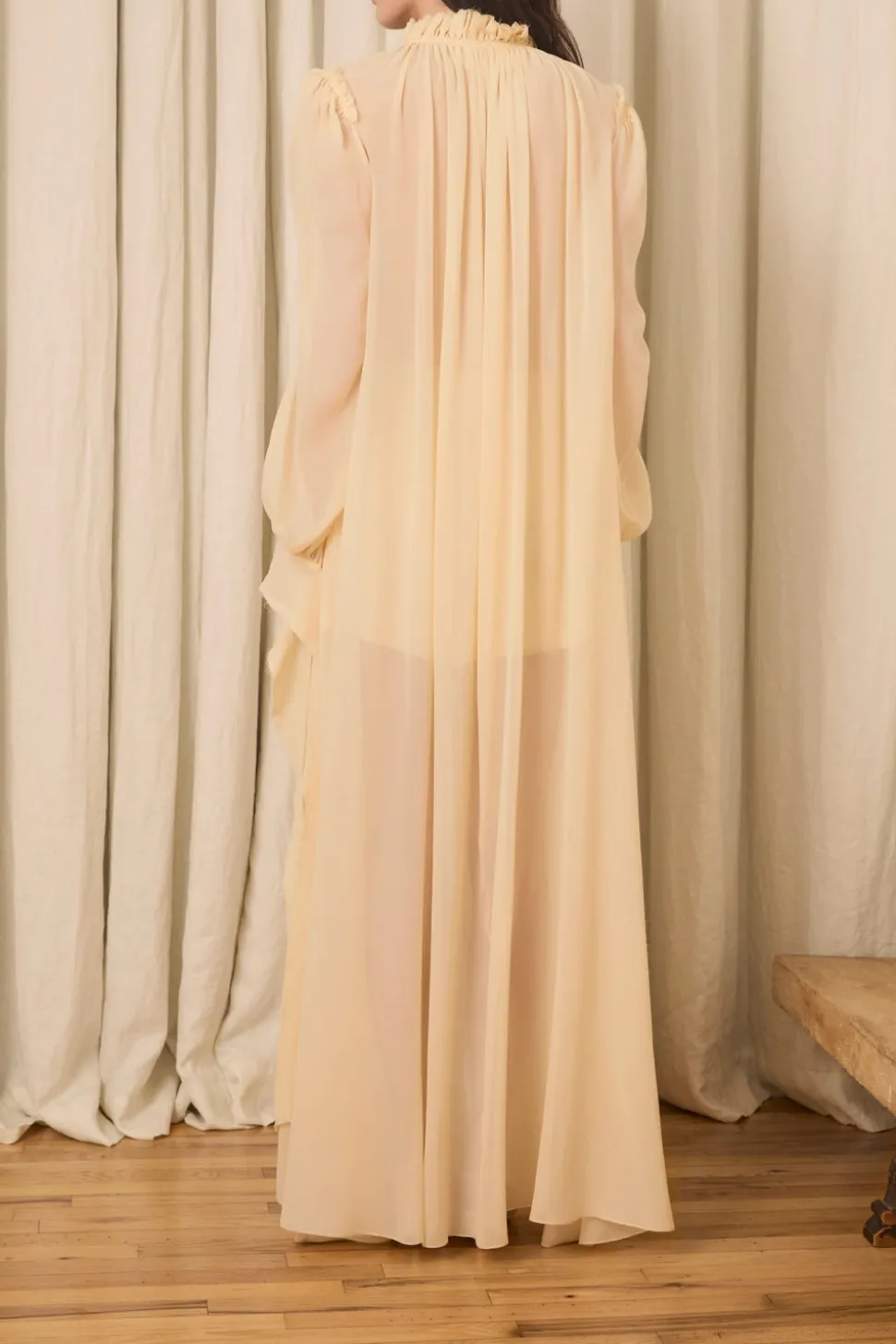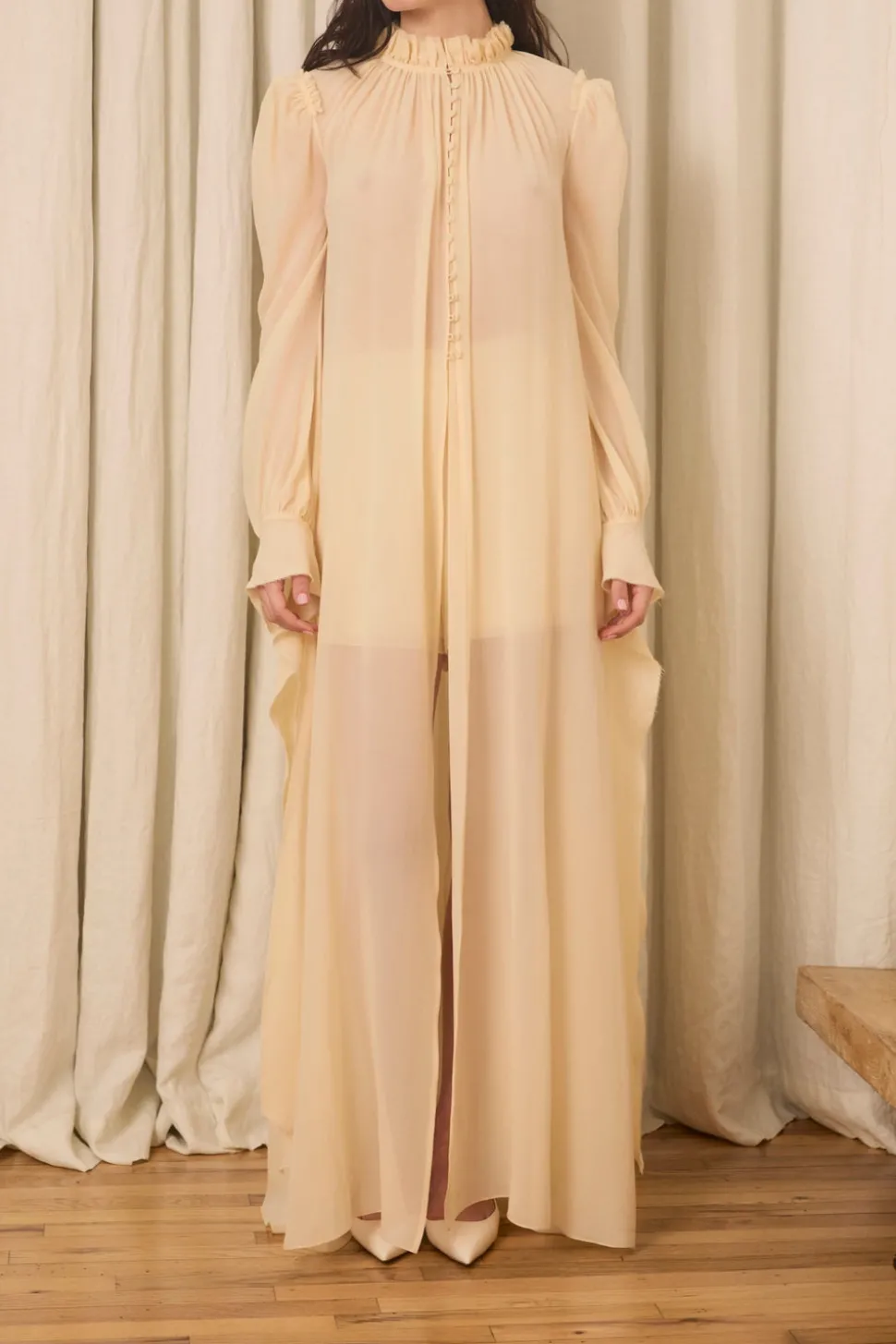 Silk chiffon. Self-covered front buttons with long, wrappable cuffs. Raw edge detailing throughout.