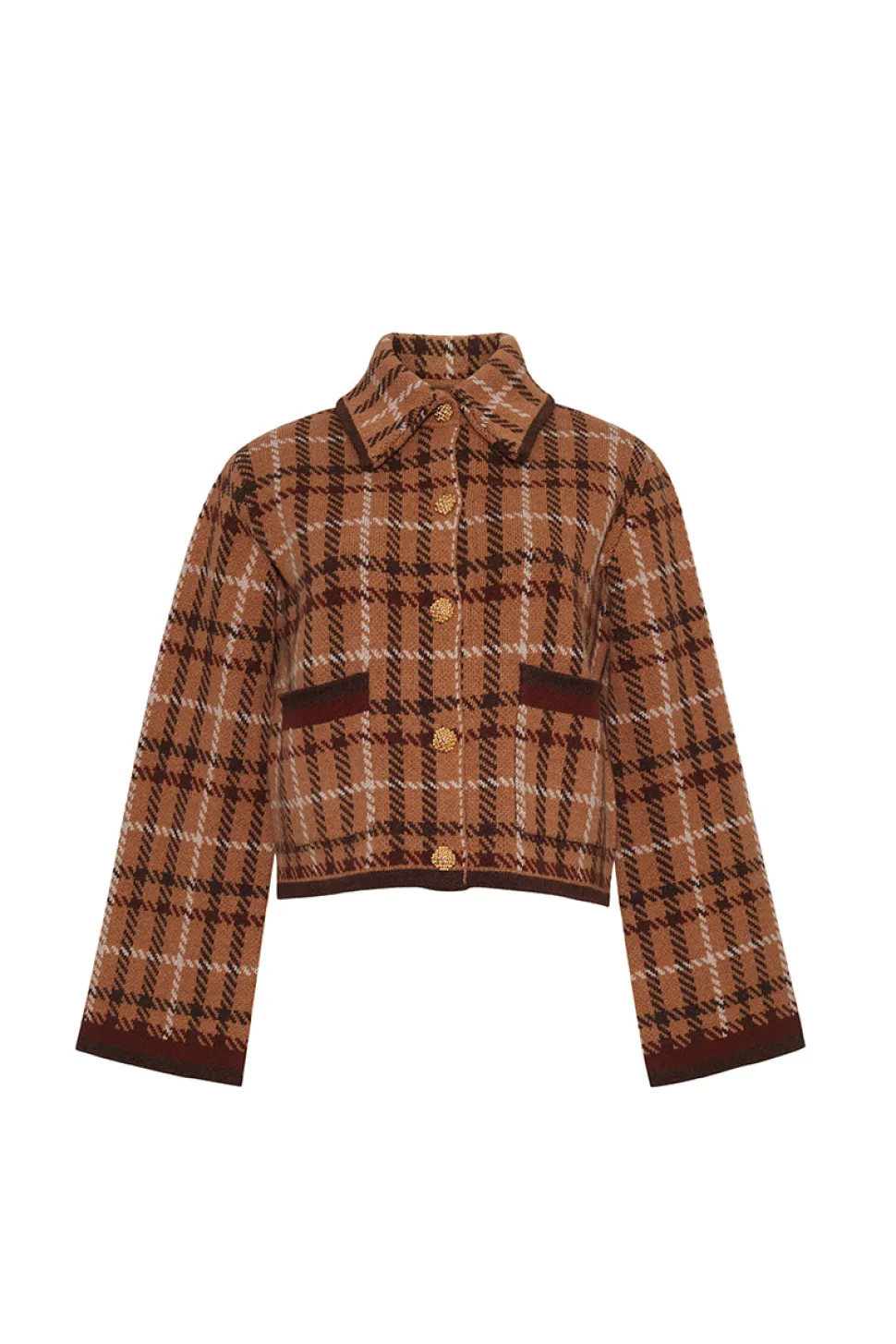 Founded by three New York City-based mothers who met through their kids, Cara Cara’s hallmarks include crisp poplin, house-designed prints, and casual glamour. The inspiration for their ethical womenswear comes from interior design, as well as the world’s most exotic locales. The Delilah Cardigan in Camel Check offers a boxy fit with long sleeves and a collared jacket silhouette. Crafted from plaid jacquard, it features multi-colored tipping at functional patch pockets, sleeves, and bottom hem, accented with novelty gold buttons and slightly flared, tapered sleeves.