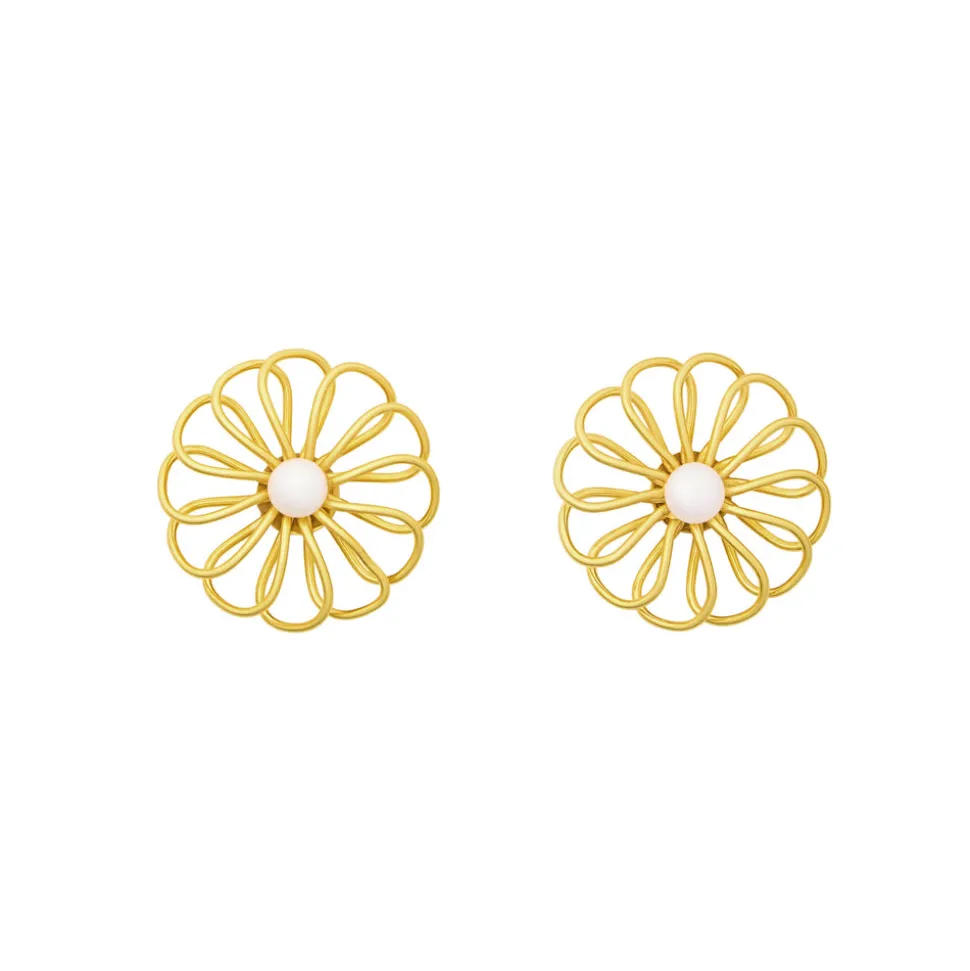 24K antique gold-plated 3D flower studs set with freshwater pearls. Featherweight. Please note that no two pearls are exactly the same; slight variations in color and detail add to their beauty.