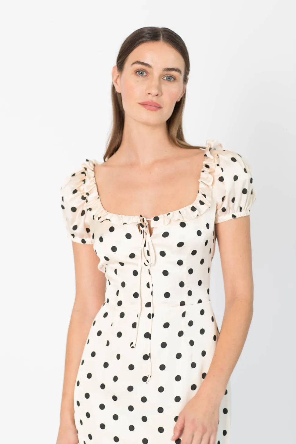 Polyester blend. Scoop neckline with ruffled edge. Fitted bodice. Polka dot print. Ankle-length. Flowing skirt.