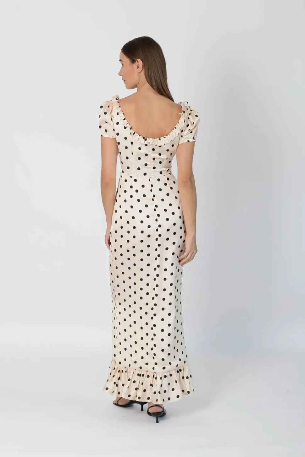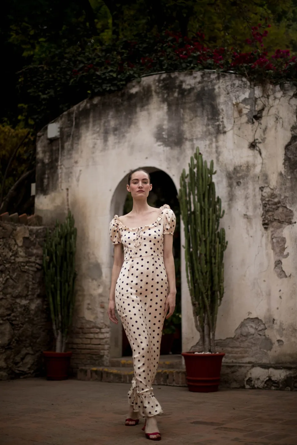 A mother to three little girls, Damaris Bailey imbues her feminine clothing line with all the optimism, courage, urgency, beauty, and possibility that comes with motherhood. The result is a collection of romantic, vibrant pieces for thoroughly modern women. Timeless with a playful twist, the Delores Dress is crafted from a soft polyester blend that drapes beautifully with any movement. Its ankle-length silhouette is adorned in a classic polka dot print, with a scoop neckline edged in ruffles, a gently fitted bodice, and a flowing skirt complete the look—ideal for everything from daytime strolls to evening soirées.