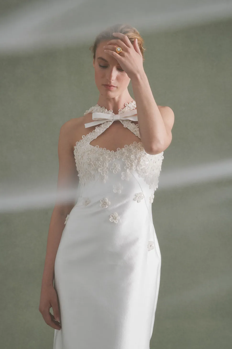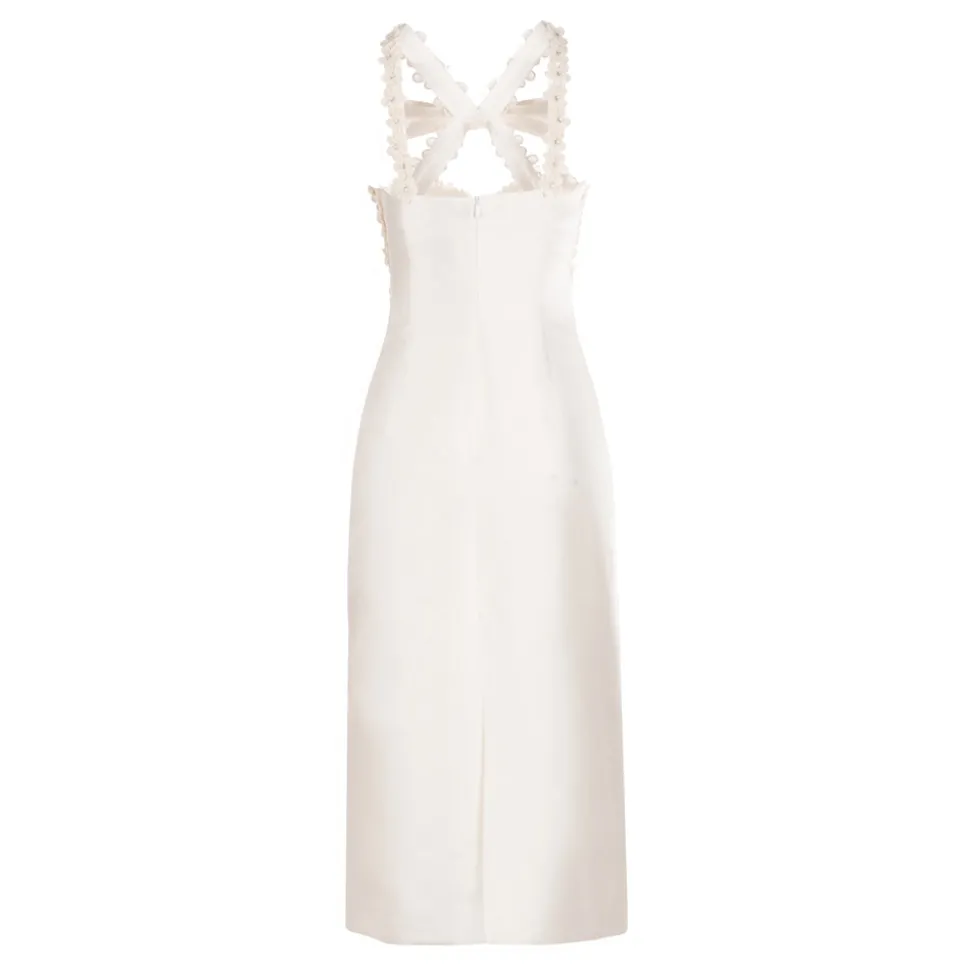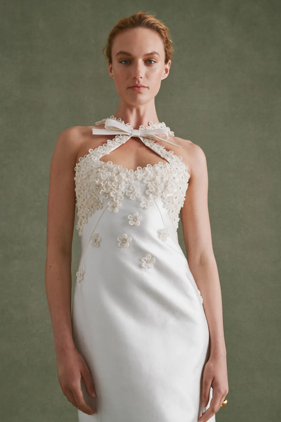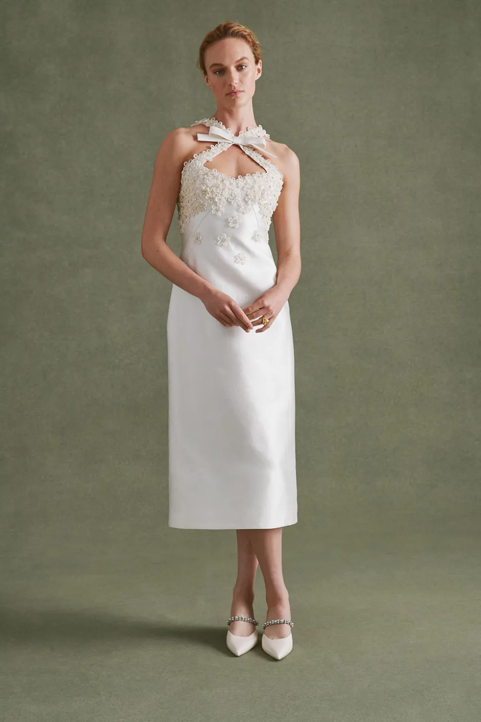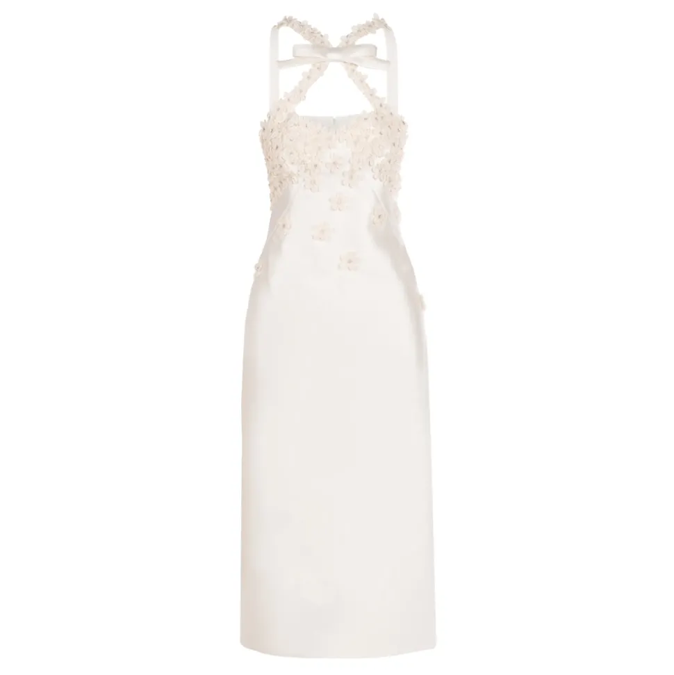 A graduate of the Savannah College of Design, award-winning Alexandra Pijut’s namesake line arrives from her studio in New York, offering luxe ready-to-wear pieces that distinguish themselves between femininity and practicality. Incorporating elements of the designer’s childhood, like equestrian tailoring and dancewear, the Delphine Dress in Ivory Silk Wool with Floral Appliqué features a column silhouette with a bow-adorned neckline. We’re spellbound by the beaded, organza flower appliqués on the bust and straps. So elegant, and sexy too.
