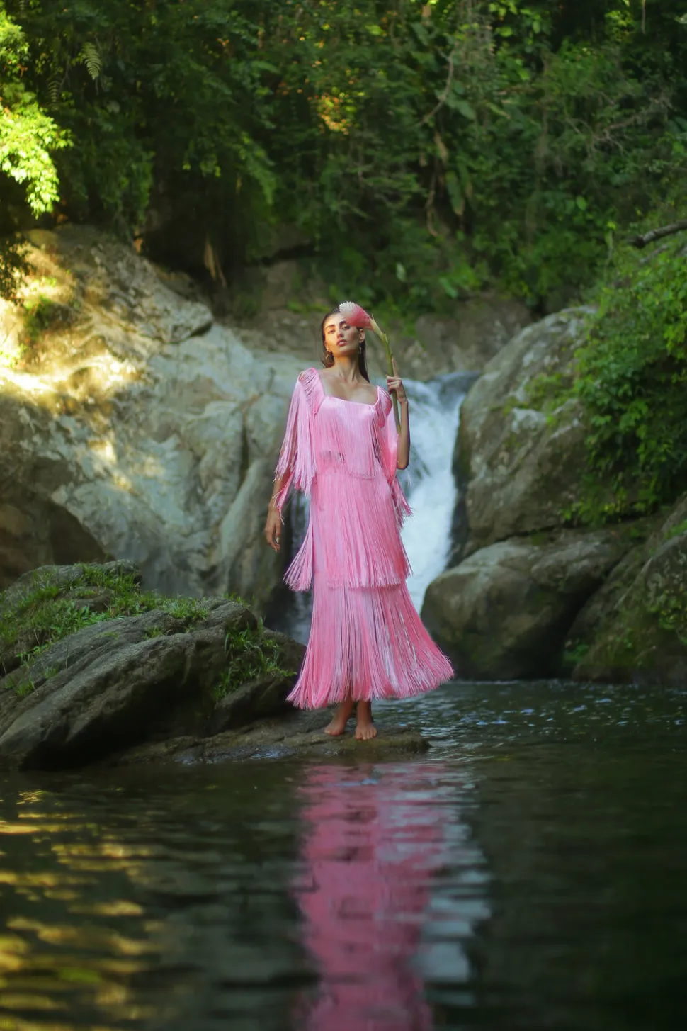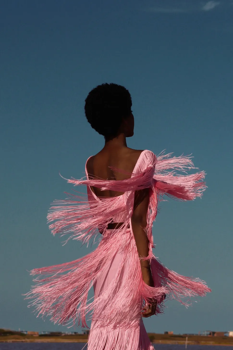 Founded by Daniela Panaro, No Pise La Grama, which translates to “don’t step on the grass,” is a Venezuelan fashion brand known for its feminine, timeless designs. As the name suggests, there’s a strong connection to nature through the elevated yet laid-back aesthetic inspired by travel and the art of traditional craftsmanship. The Delta Top In Pale Pink offers movement and style. The square neckline and cascading fringe create a twirl-worthy look, especially when paired with the coordinating Delta Skirt.