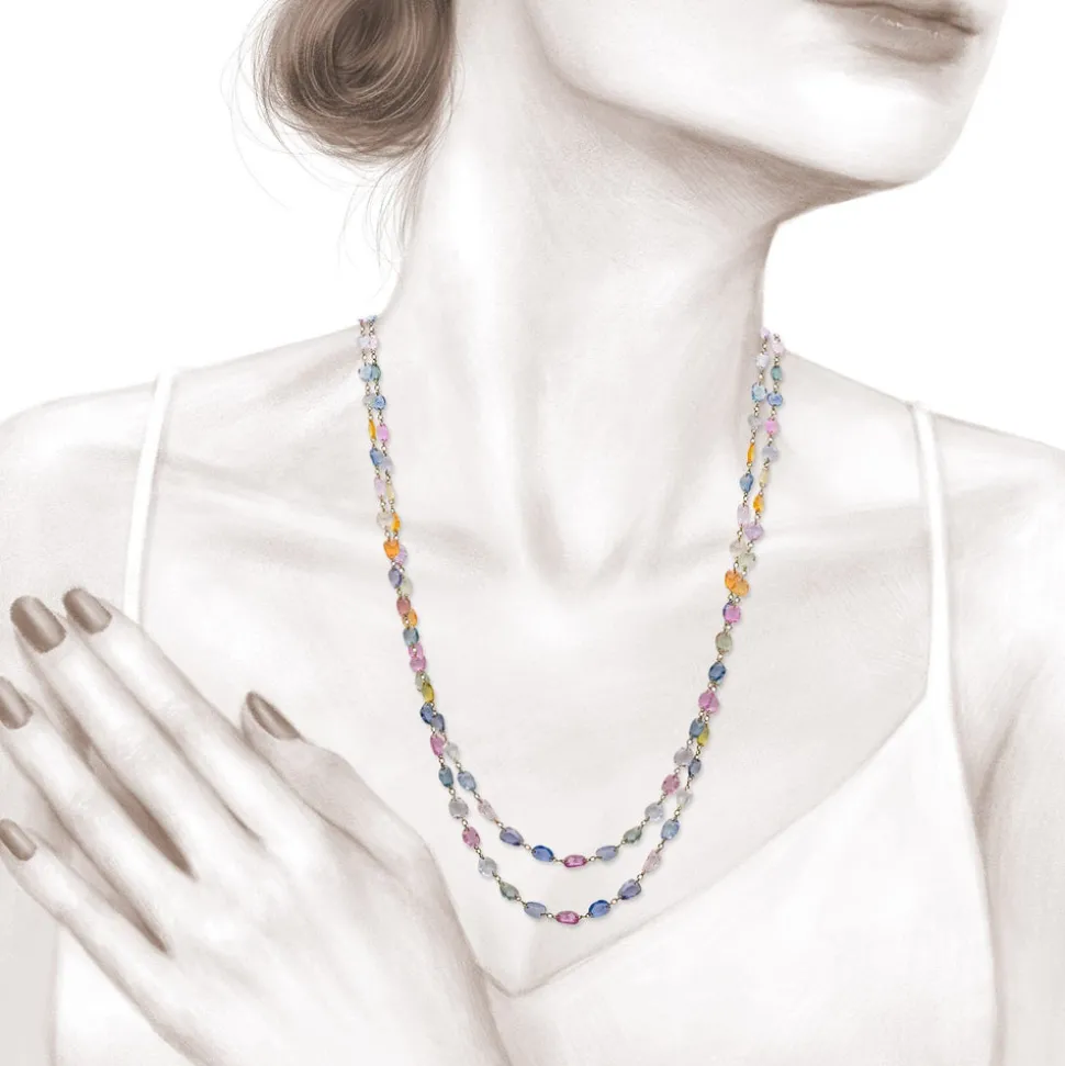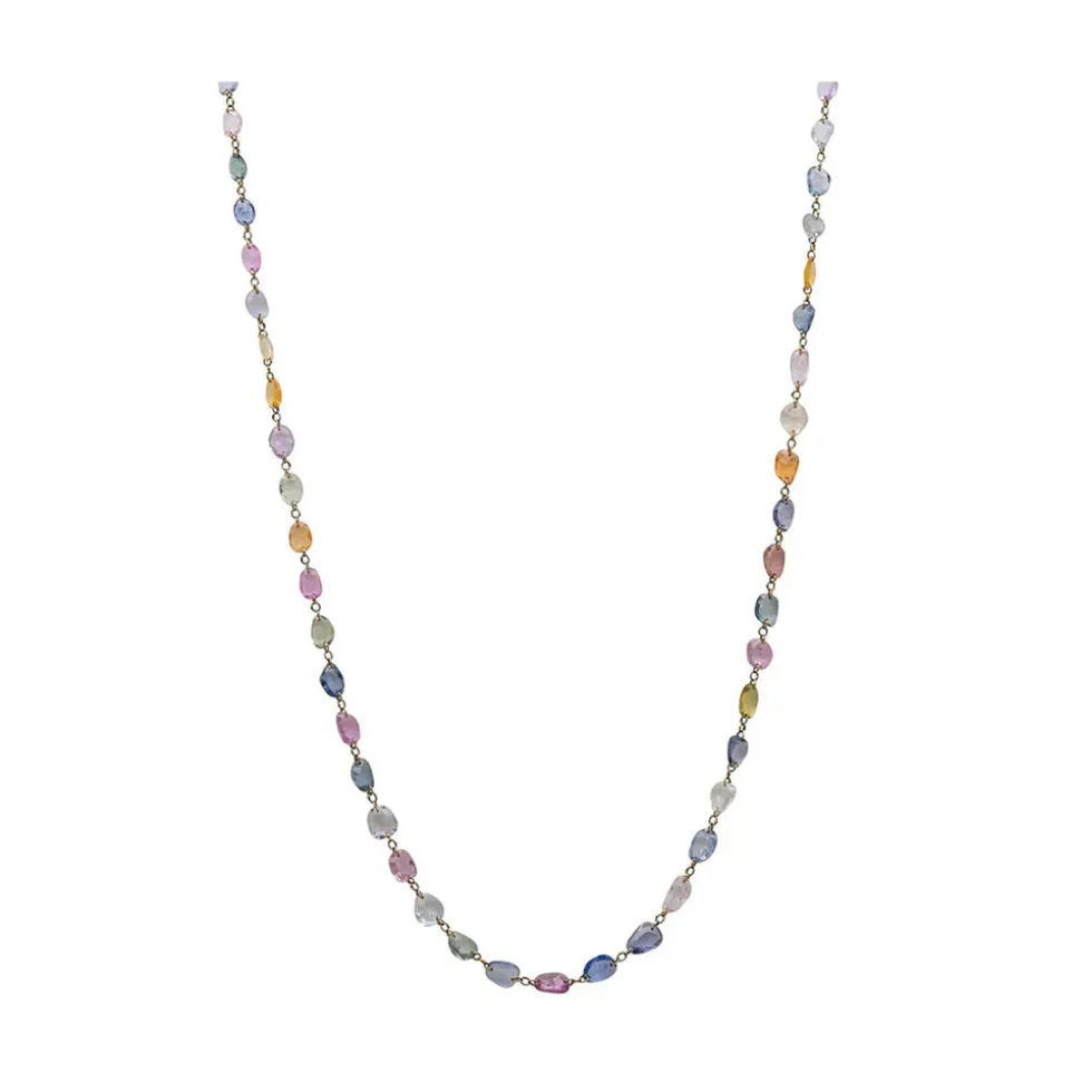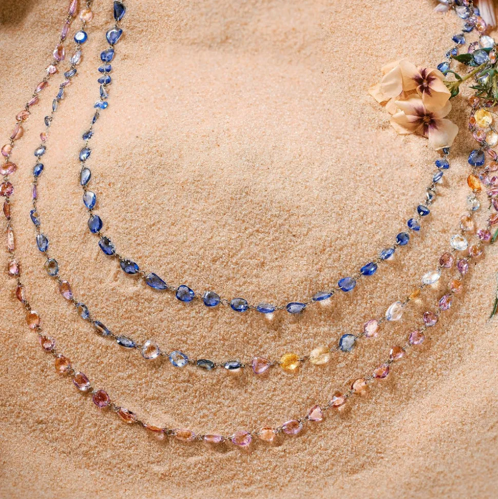 Luxury jewelry house, RUCHI New York, specializes in creating unique and versatile pieces that are exquisitely handmade and boast an heirloom quality. Crafted with precision in a variety of metals, each piece by this brand is designed to be cherished as a symbol of enduring love, whether it’s a stunning diamond ring or a timeless necklace. The Desert Blooms Wildflower Multi-Colored Sapphire Long Necklace boasts candy hued multi-colored sapphires on a slice chain. Ideally serves perfectly for layering.