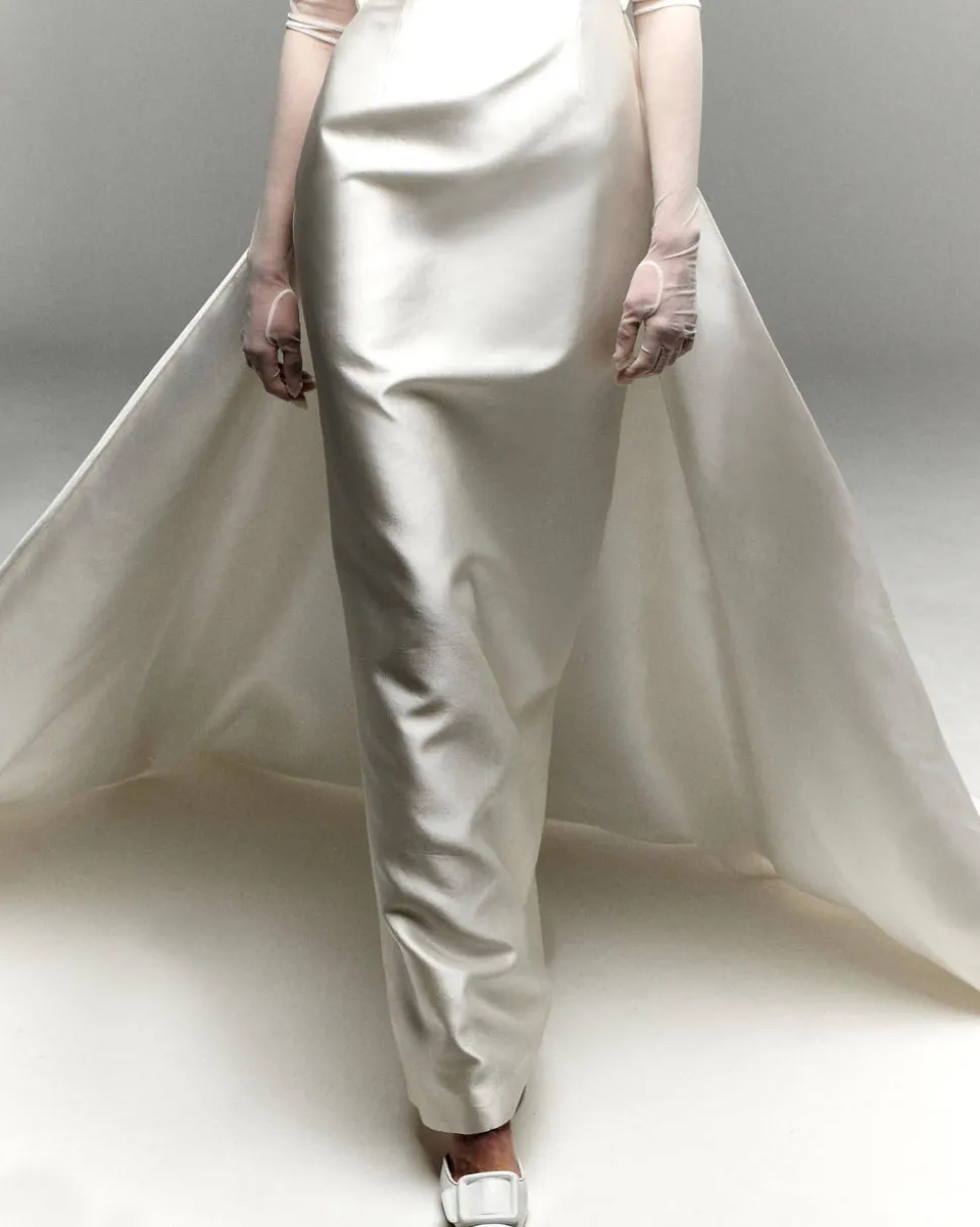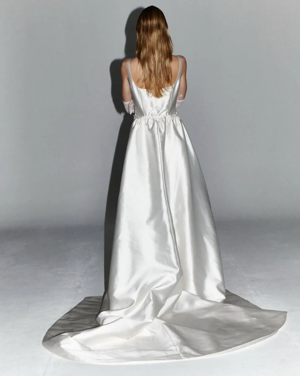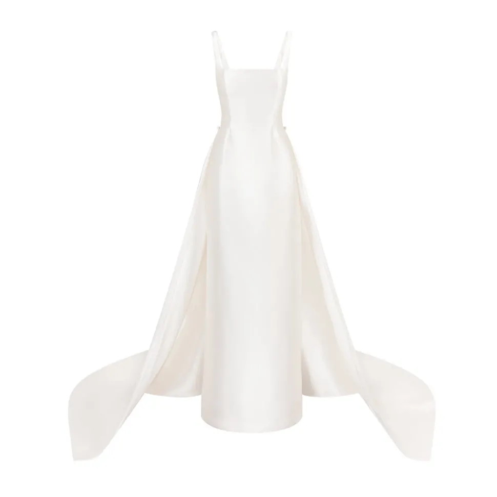 Handmade at its London atelier, The OWN Studio’s signature style combines pared-back, contemporary silhouettes with unexpected vintage details resulting in considered, minimal styles for the modern woman. The label brings a fresh and contemporary approach to wedding and evening wear. Inspired by the high fashion New York socialites of the 1950s, the Detachable Silk Train | STYLE 112 is the ultimate accent piece. Pair with any of the structured column pieces for an incredibly impactful entrance.