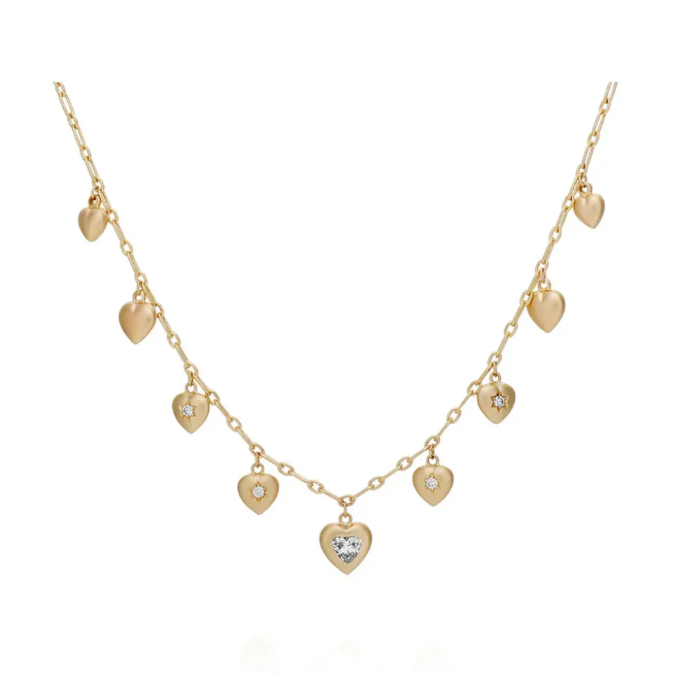 From her studio in New York City, Ashley Zhang designs one-of-a-kind fine jewelry that will last a lifetime. Inspired by a Late Victorian era charm necklaces, the sweet Diamond Puffy Heart Necklace features elongated oval links in the solid gold chain, and nine graduated puffy heart charms with a beautiful satin finish. Each charm features four old mine cut diamonds set in hand-carved star settings, as well as a stunning heart shaped diamond in the center.