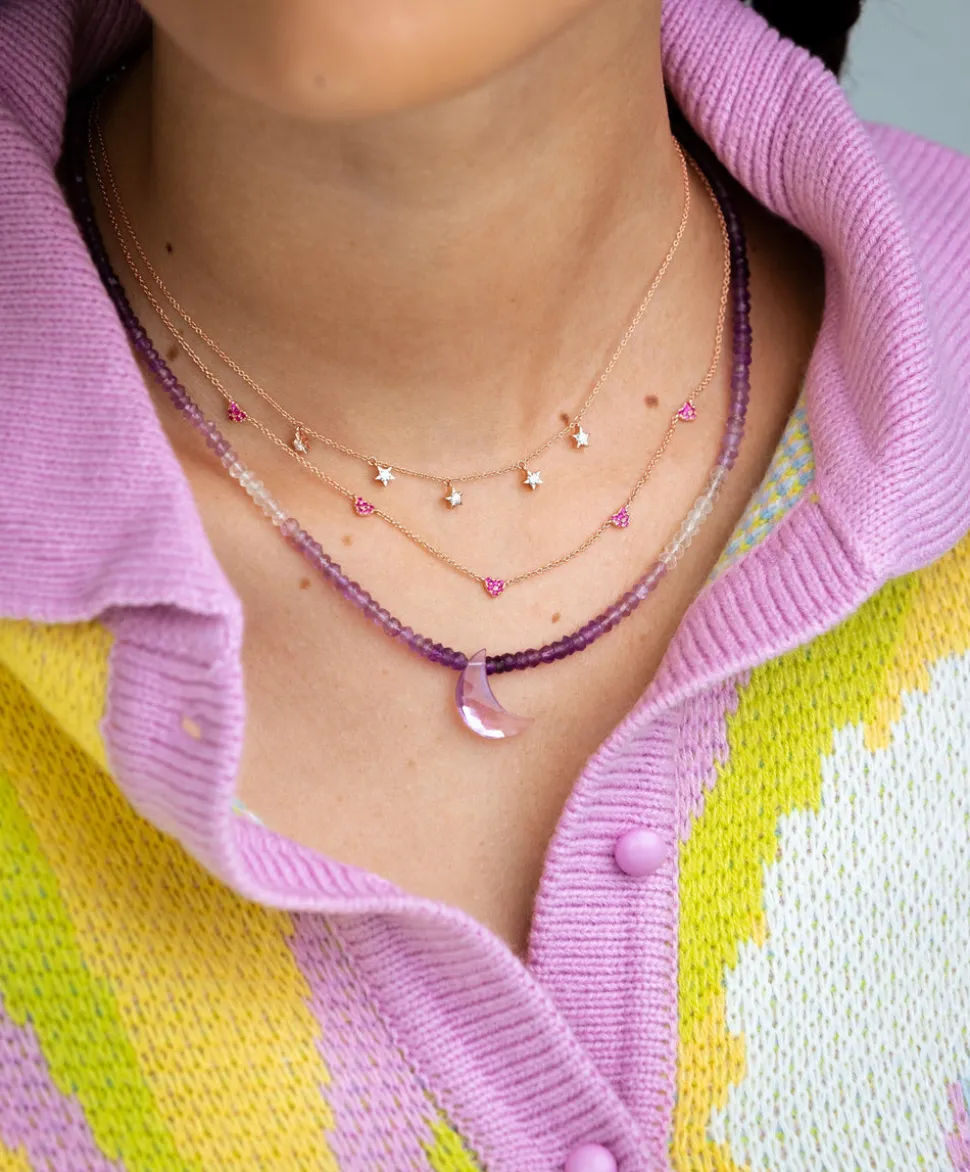 Timeless cool and ethical sourcing are at the heart of London-based Roxanne First’s fine jewelry studio. Solid gold, beautiful beads, and hand-picked diamonds come alive in her vibrant, fun-loving collections that find the meeting place of whimsy and contemporary luxury. Diamond encrusted stars grace the gold chain along the Diamond Star Necklace, a celestial celebration we love layered with other pieces, or on its own.