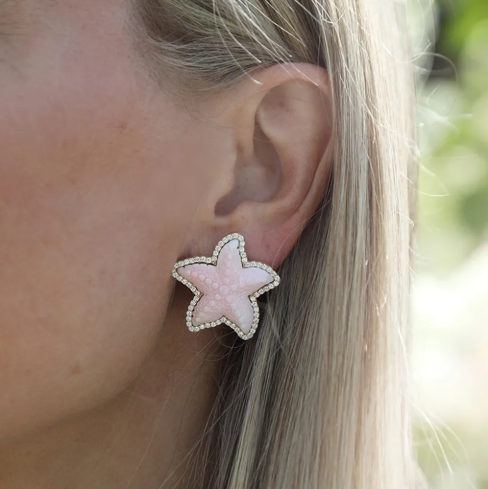 Inspired by art, architecture and the founder’s global journeys, ASHA by Ashley McCormick introduces bold, sophisticated jewelry and accessories made from only the finest materials. From everyday glamour to the red carpet, these statement pieces are classic additions to your collection. Simple but elegant, the Diamond Starfish Studs are cast 18-karat dipped gold with pink conch shell detailing and a pave diamond border.