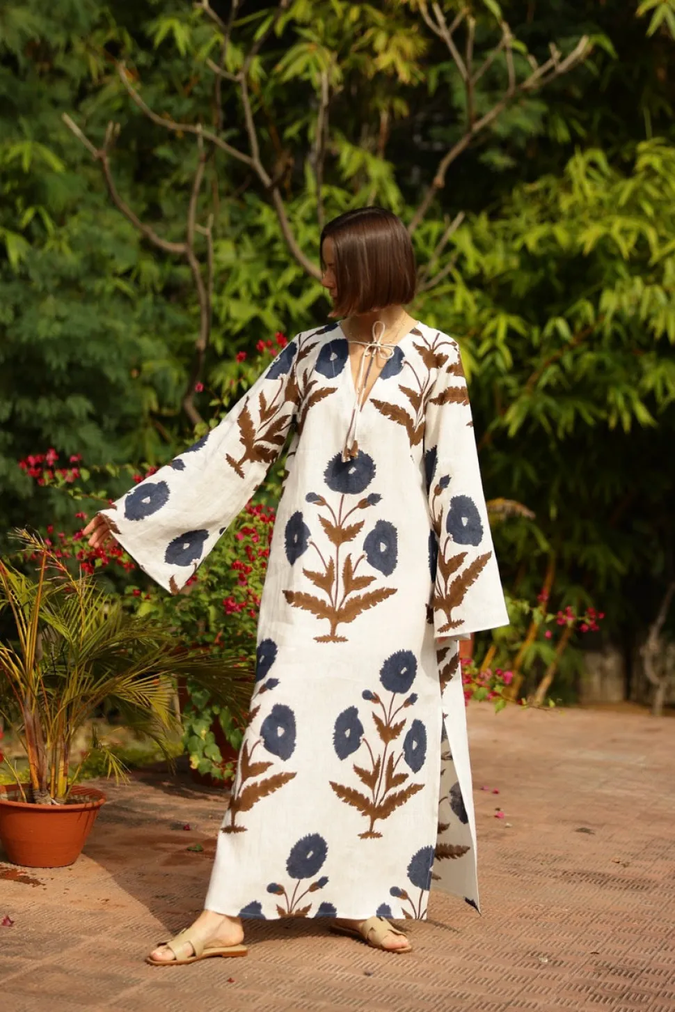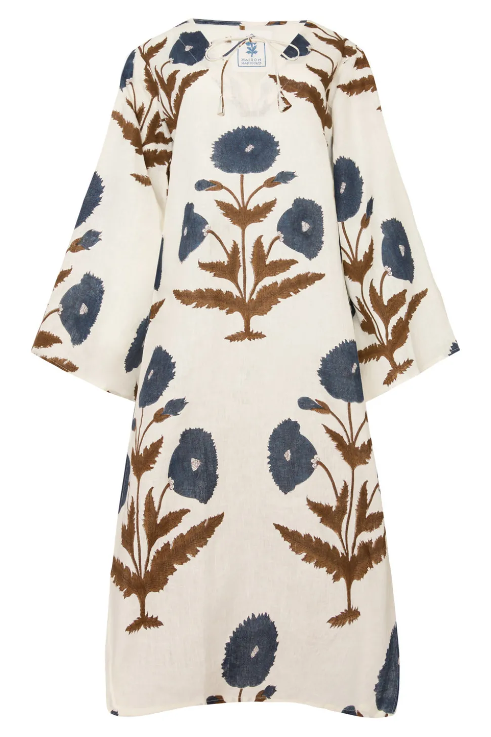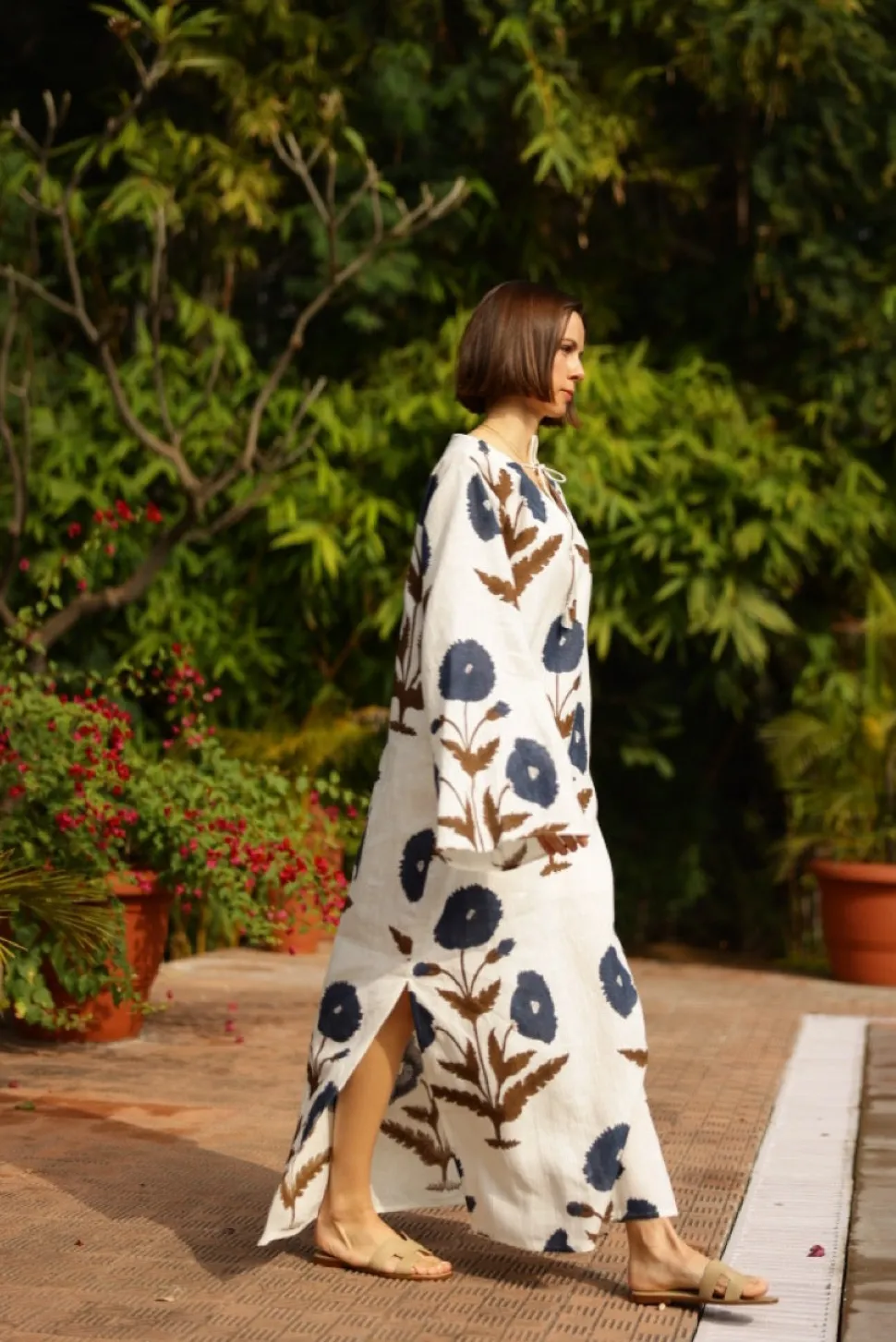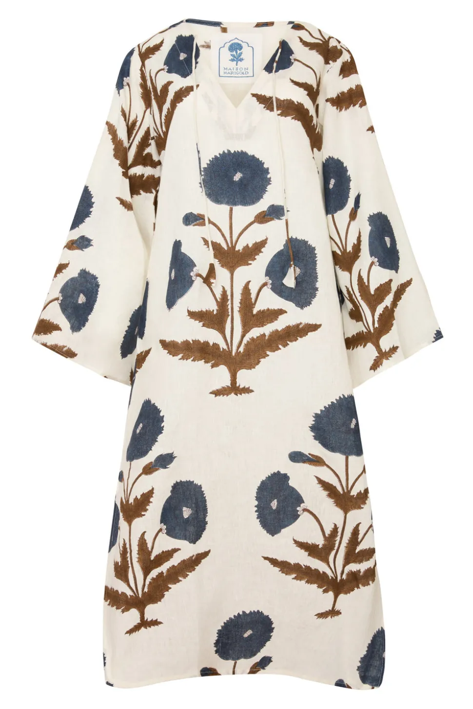 Introducing Maison Marigold, a new luxurious small-batch women’s resortwear brand inspired the wanderlust of travel. Our collections effortlessly transition from beachside lounging to an elegant evening on the town. The simplicity of design and classic silhouettes are the foundations for each and every style. Hand-printed linen and cotton make for comfortable and effortless pieces that are both feminine and flattering. The Doha Caftan is a 100% European linen statement piece that will have heads turning. It is an easy no-fuss silhouette perfect for covering up after a day at the pool or heading out for an al-fresco night out. It features beautiful exaggerated bell sleeves, v-neckline with an optional tie and side seam slits for ease of movement. This kaftan looks lovely on all body types.