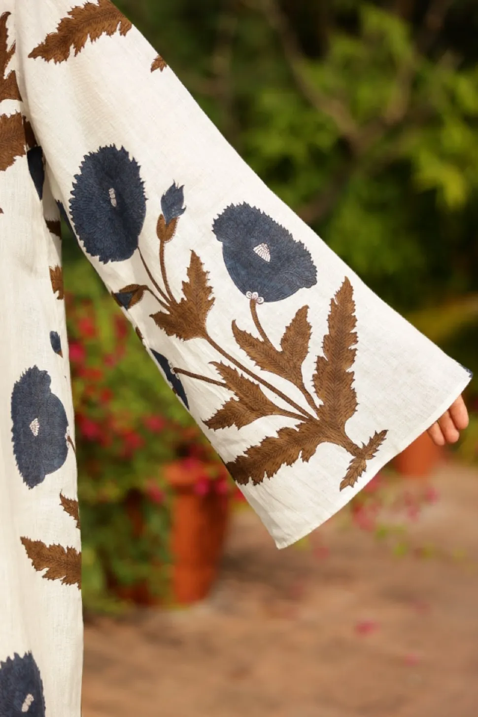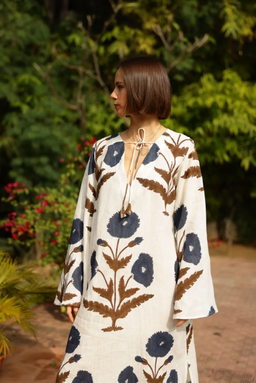 Hand printed on 100% European linen. Fit and flair style. High side seam slits. Feather-light feel.