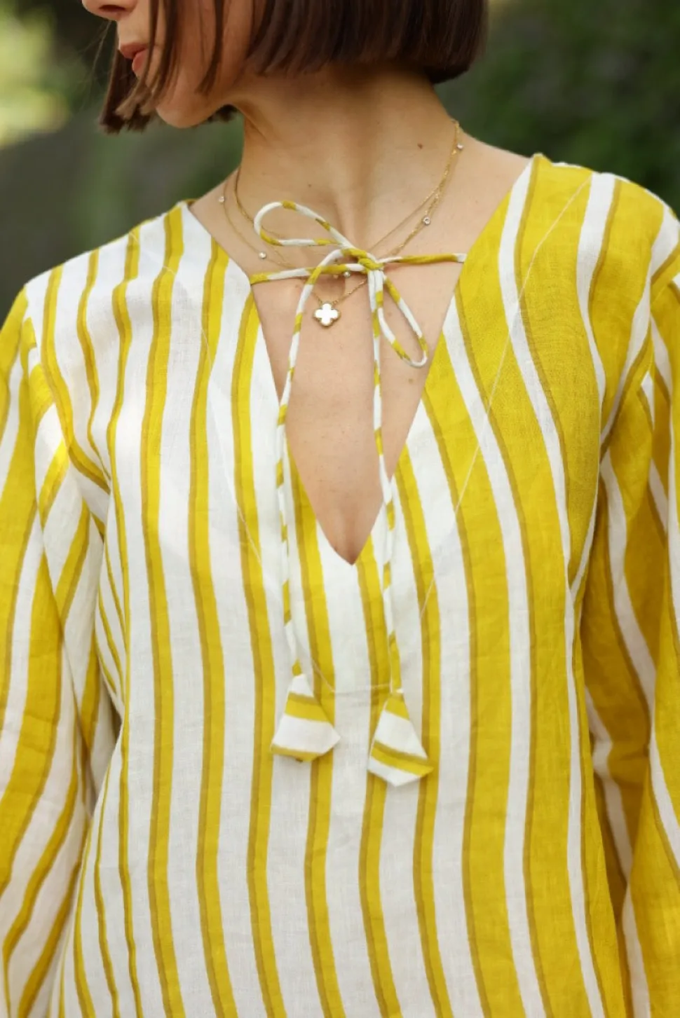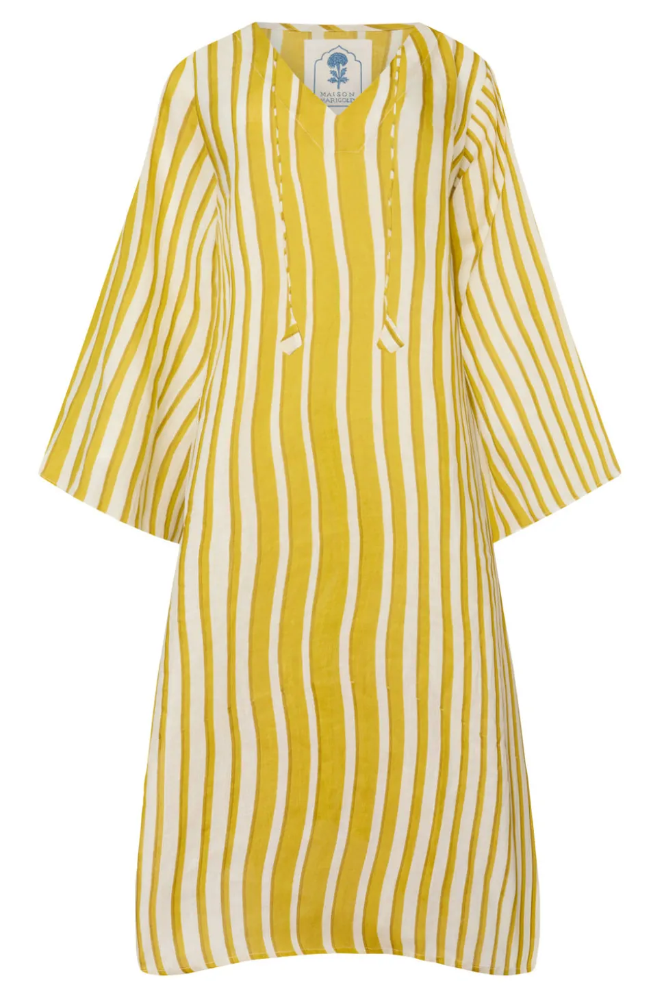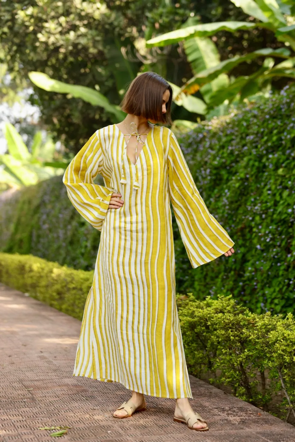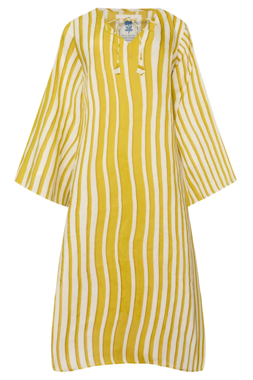 Introducing Maison Marigold, a new luxurious small-batch women’s resortwear brand inspired the wanderlust of travel. Our collections effortlessly transition from beachside lounging to an elegant evening on the town. The simplicity of design and classic silhouettes are the foundations for each and every style. Hand-printed linen and cotton make for comfortable and effortless pieces that are both feminine and flattering. The Doha Caftan is a 100% European linen statement piece that will have heads turning. It is an easy no-fuss silhouette perfect for covering up after a day at the pool or heading out for an al-fresco night out. It features beautiful exaggerated bell sleeves, v-neckline with an optional tie and side seam slits for ease of movement. This kaftan looks lovely on all body types.