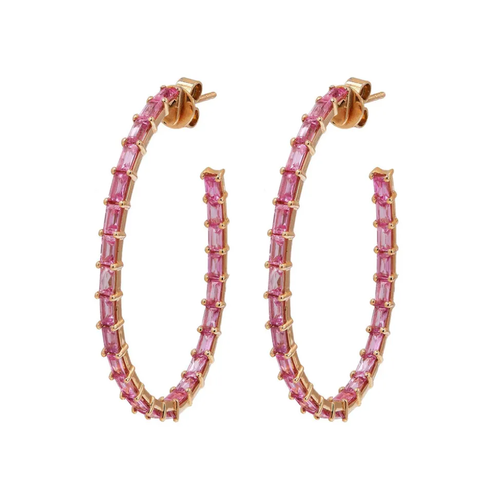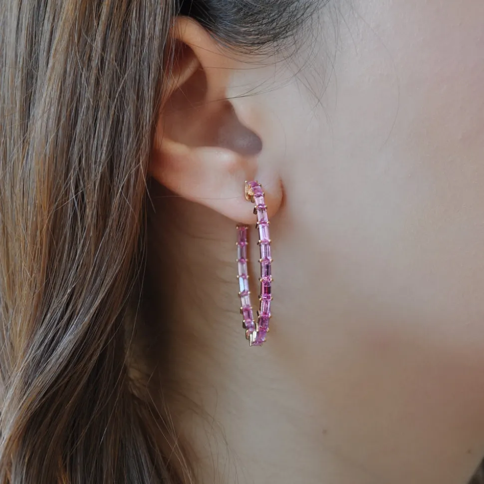 Luxury jewelry house, RUCHI New York, specializes in creating unique and versatile pieces that are exquisitely handmade and boast an heirloom quality. Crafted with precision in a variety of metals, each piece by this brand is designed to be cherished as a symbol of enduring love, whether it’s a stunning diamond ring or a timeless necklace. The Dolce Pink Sapphire Hoop Earrings feature pink sapphire baguettes adored throughout. These hoops will sparkle with shimmering, playful color.