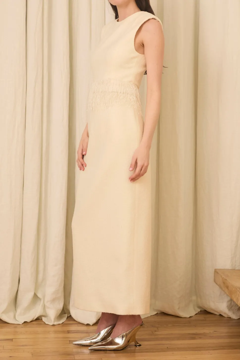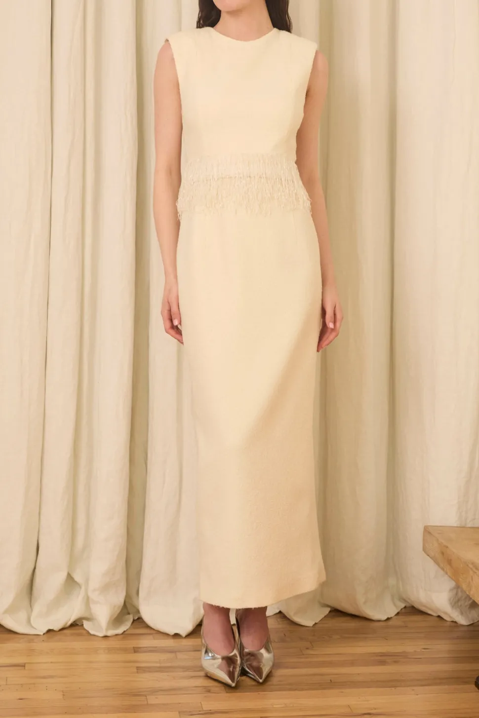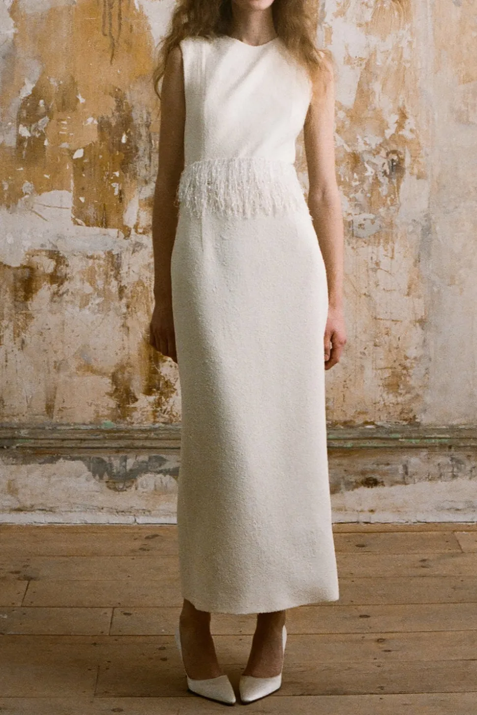 After honing her design vision and couture experience at Zac Posen, Narciso Rodriguez, and Chanel, Meredith Stoecklein emerges on her own with LEIN. The brand offers a new concept of tasteful, stylish wedding wear for the thoroughly modern bride. The Dolores Midi Dress in Boucle is a slim style tailored in Italian bouclé with soft padding in the shoulder. Styled with Fringe Belt.