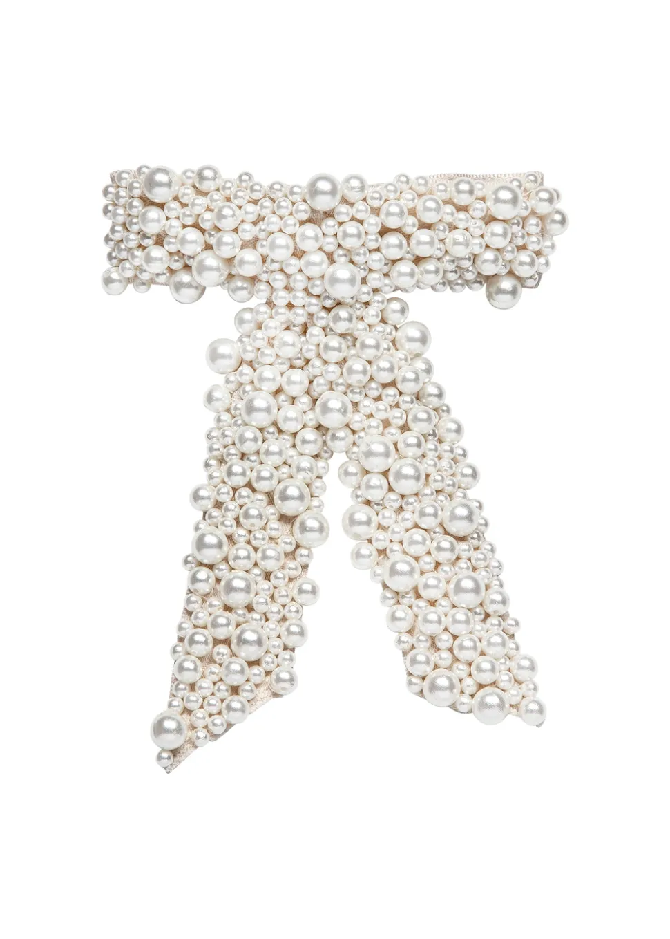 The Donna Bow Barrette is made by hand in New York of pearl embroidery with a steel French barrette closure.