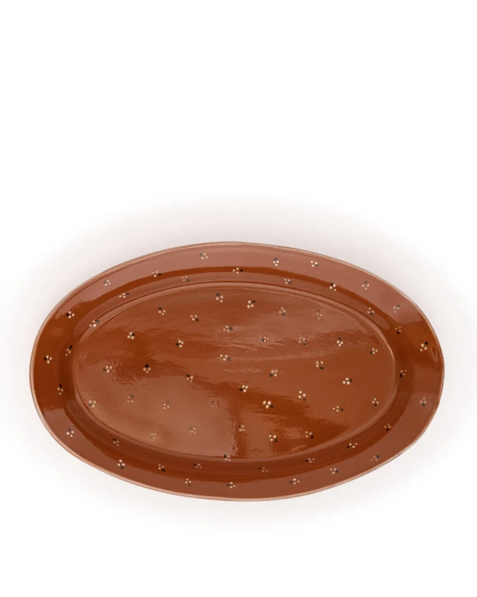 A former fashion and lifestyle journalist, Louise Roe founded Sharland England to bring inspiration and nostalgia to household items. The brand supports slow, meaningful design and traditional artisanship with tabletop, household and rattan items that are built to last. Rustic and full of charm, the Dotty collection is inspired by an antique terracotta fragments and handmade in Southern Italy. The Dotty Serving Platter is an attractive way to present larger fishes, or family style meals, or to set out apps and desserts.