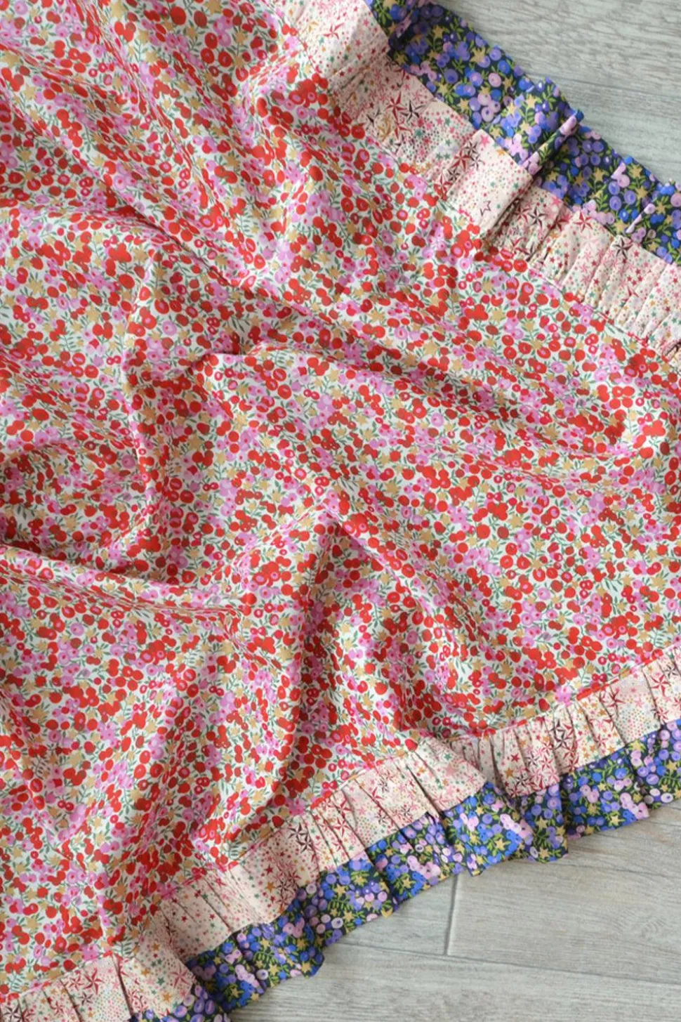 Made with 100% Liberty Tana Lawn® Cotton. Thread count 240. Features an abundant double ruffle edge. Made using three contrasting and complementary Liberty prints.