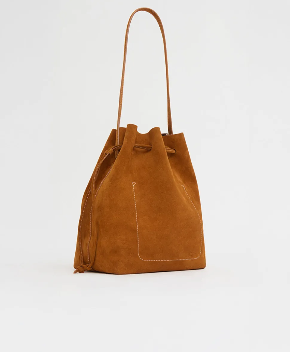 Founded in 2013, Mansur Gavriel redefines luxury through its distinctive approach to color and form. Born out of a passion for art and design, Rachel Mansur and Floriana Gavriel created two simple silhouettes—launching with just a bucket and tote. The brand’s designs, dreamt up in New York and crafted in Italy, continually challenge the notions of what expression can be. The Drawstring Cabas in Saddle Suede reimagines the brand’s iconic Cabas silhouette into a softly structured bucket bag. Featuring elongated handles, a magnetic closure, and an interior pocket, this spacious design is refined yet practical—large enough to accommodate a 14″ MacBook Pro with ease.