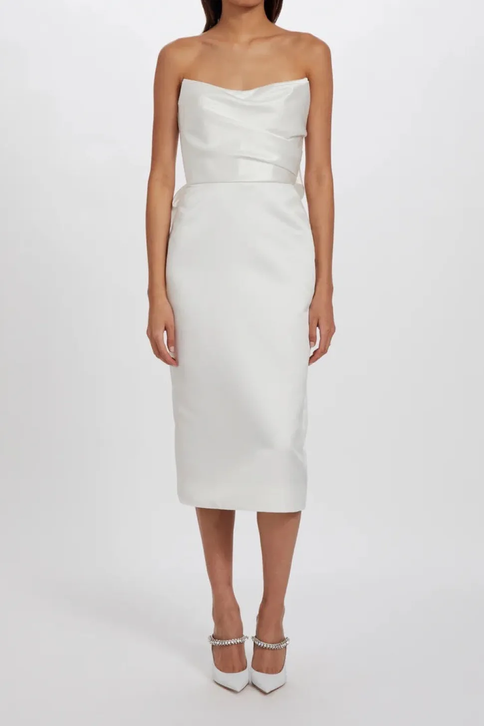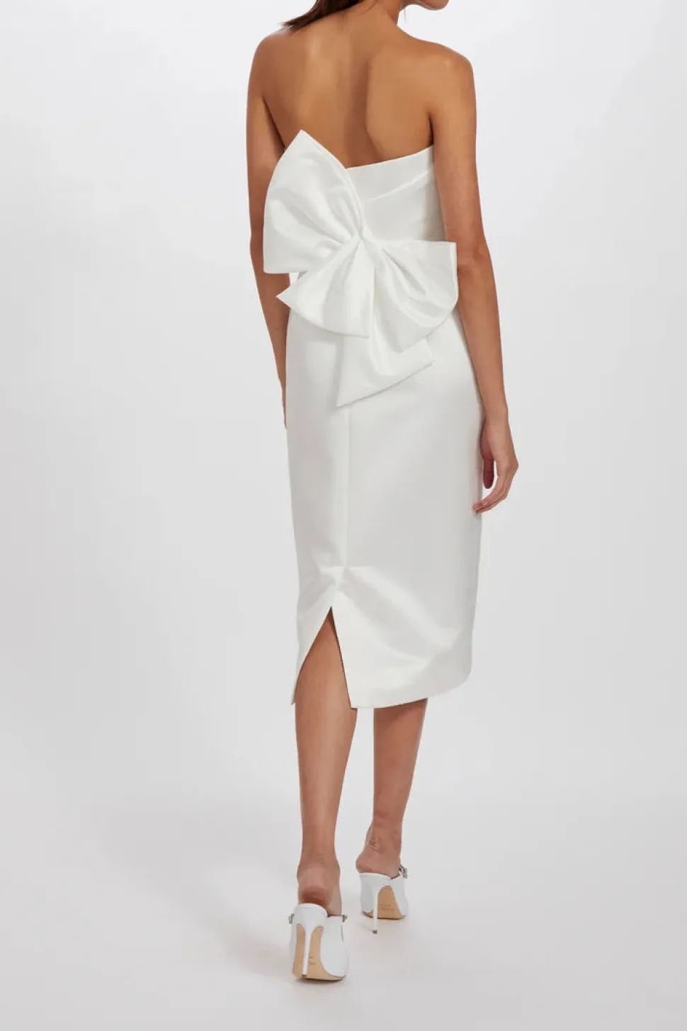 Over three decades ago, Ethiopian-born Amsale Aberra began crafting modern, personalized wedding dresses, beginning with her own. Today, her distinct bridal gowns—handmade with couture techniques in AMSALE’s New York City atelier—share their tasteful femininity, unstated glamour and attention to detail with sophisticated women the world over. The Duchess Satin Bow Dress is a satin slim dress with a voluminous bow detail in the back.