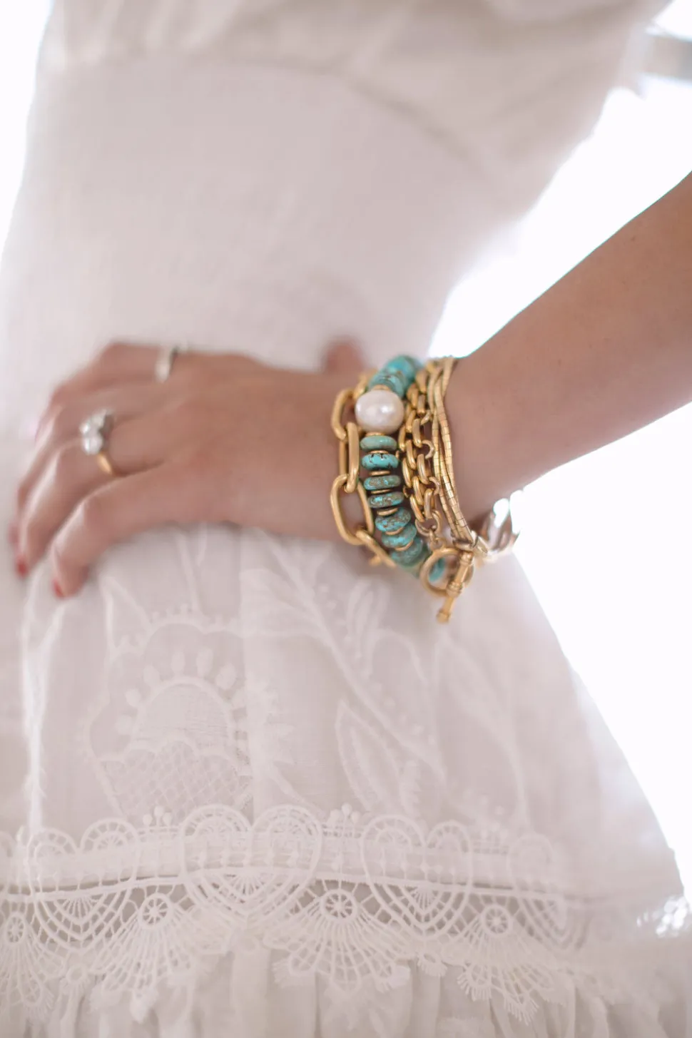 Semi-precious turquoise rondelle beads or freshwater pearl discs and 24 karat, antique, gold-plated slices, adorned with a large freshwater pearl. Toggle closure.