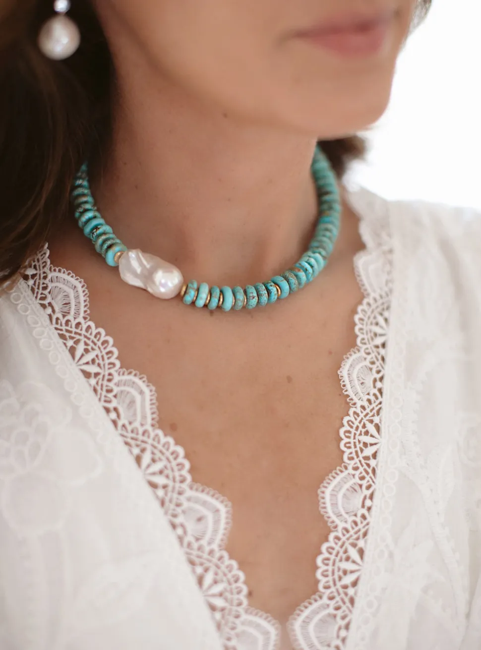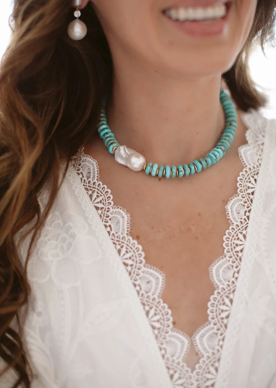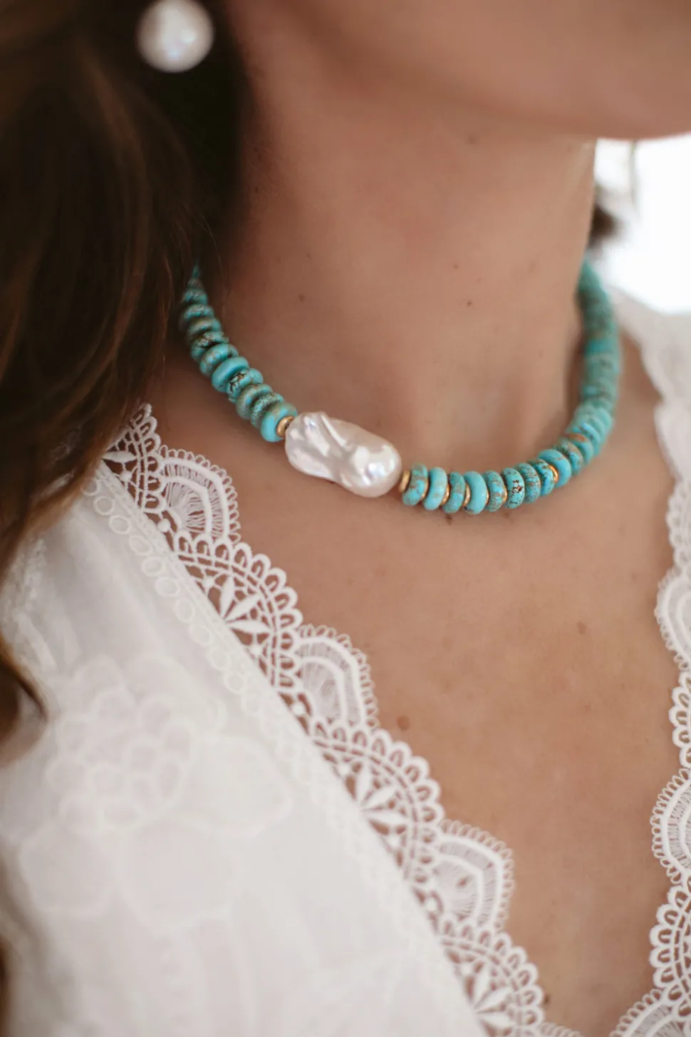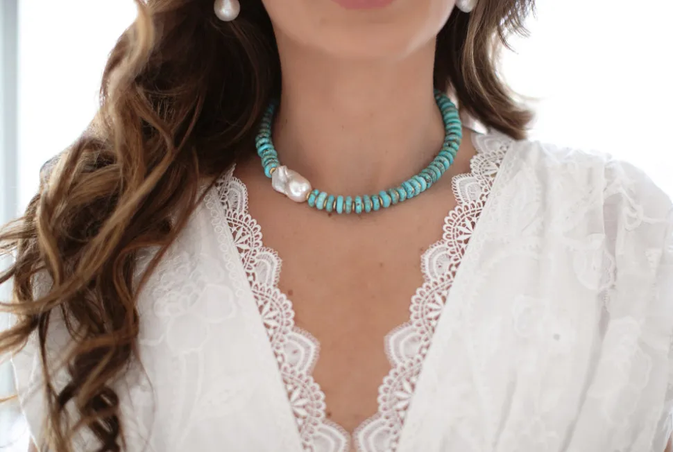 Semi-precious turquoise rondelle beads or freshwater pearl discs and 24 karat, antique, gold-plated slices, adorned with a large freshwater pearl. Toggle closure.