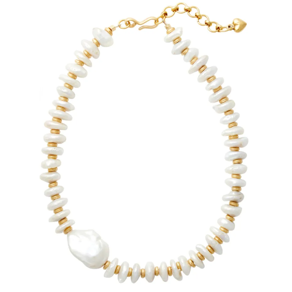The mother-daughter duo behind Brinker + Eliza combine their experience in metalsmithing and fashion to create incredibly unique jewelry that feels custom-made. Employing pearls, shells, and earth’s most prized organic forms, these are pieces to be not just worn but treasured. Drawing eyes with its contrasting shapes and natural curves, the Dune Necklace brings together freshwater pearl discs or turquoise rondelle beads with golden slices. It’s chunky, it’s funky, and out of this world cool.