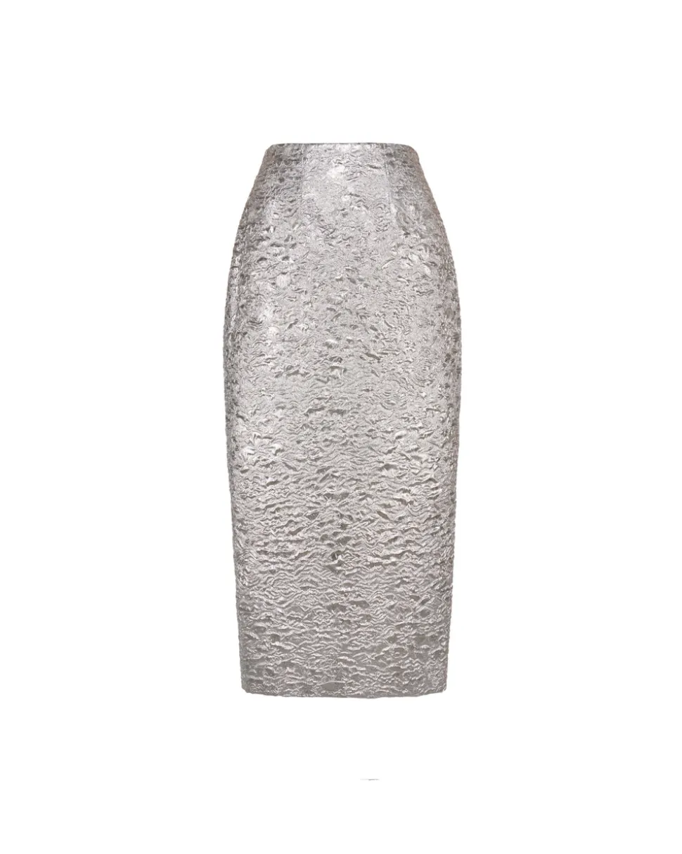 A graduate of the Savannah College of Design, award-winning Alexandra Pijut’s namesake line arrives from her studio in New York, offering luxe ready-to-wear pieces that distinguish themselves between femininity and practicality. Crafted in luxurious, metallic silver brocade, the Effie Pencil Skirt offers a classic silhouette in a modern, textured fabrication. This lustrous fabric is woven with a subtle floral design that reflects light for a maximalist effect.