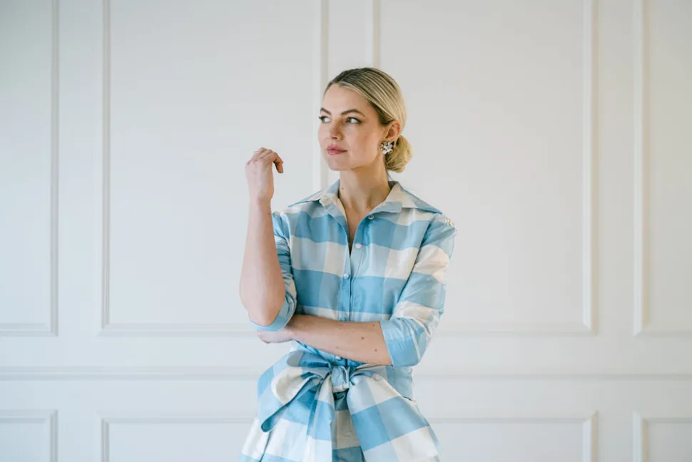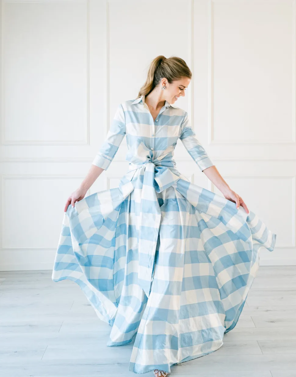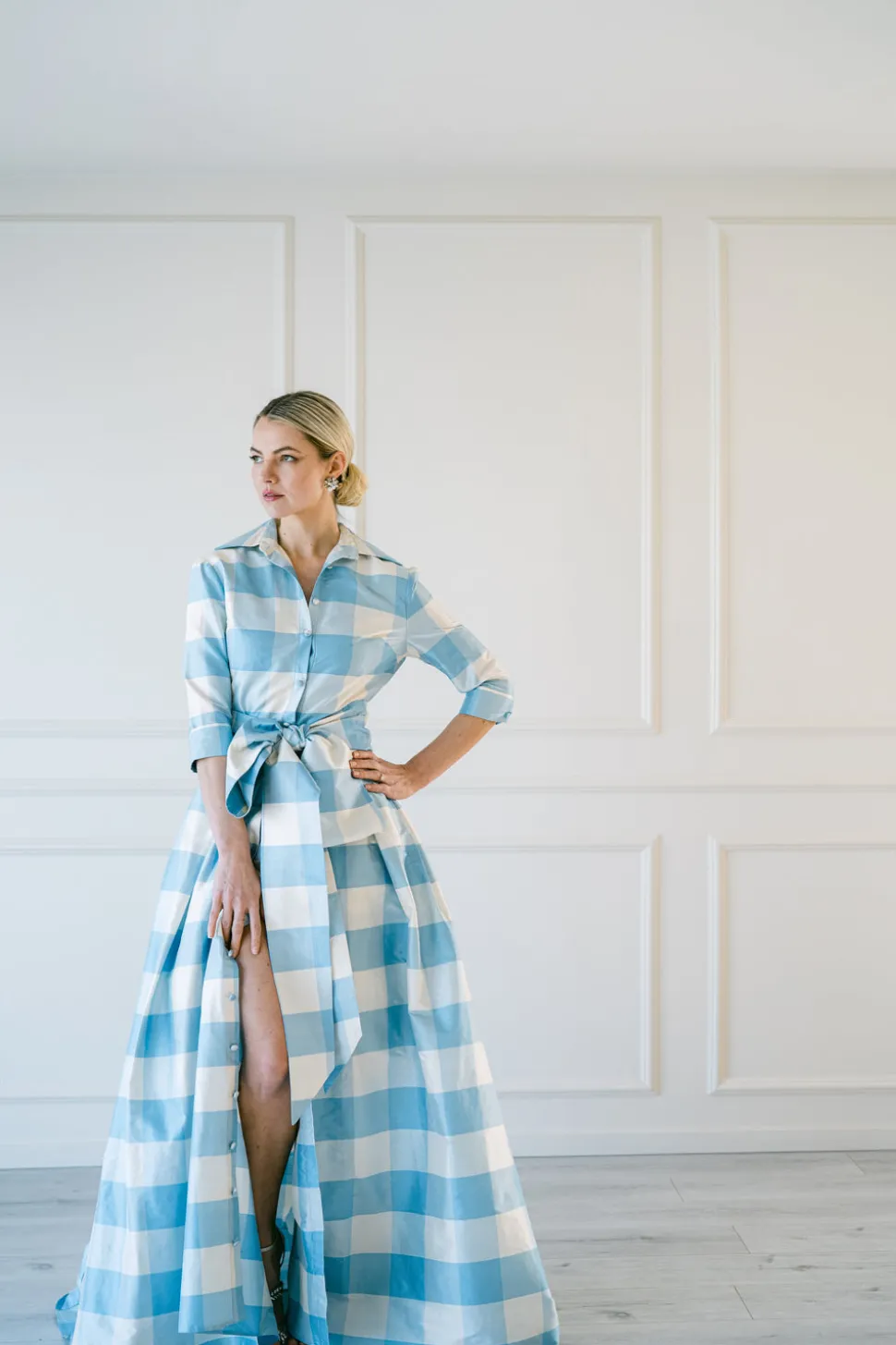 Designed in a California atelier, Luciana Emilia brings a sense of modern grandeur to elegant occasions. Born from the founder’s own wedding, where she designed bespoke gowns for her mother and bridesmaids, each piece captures a sculptural balance of dramatic silhouettes, exquisite fabrics, and artful femininity. The Effortlessly Elegant Gown in Large Blue Check is a study in timeless grace. With its classic collared neckline, softly structured silhouette, and flattering self-tie bow belt, this full-length style is a refined choice for the mother of the bride or groom—and a quiet celebration of enduring style.