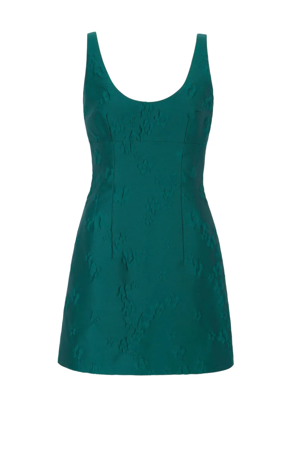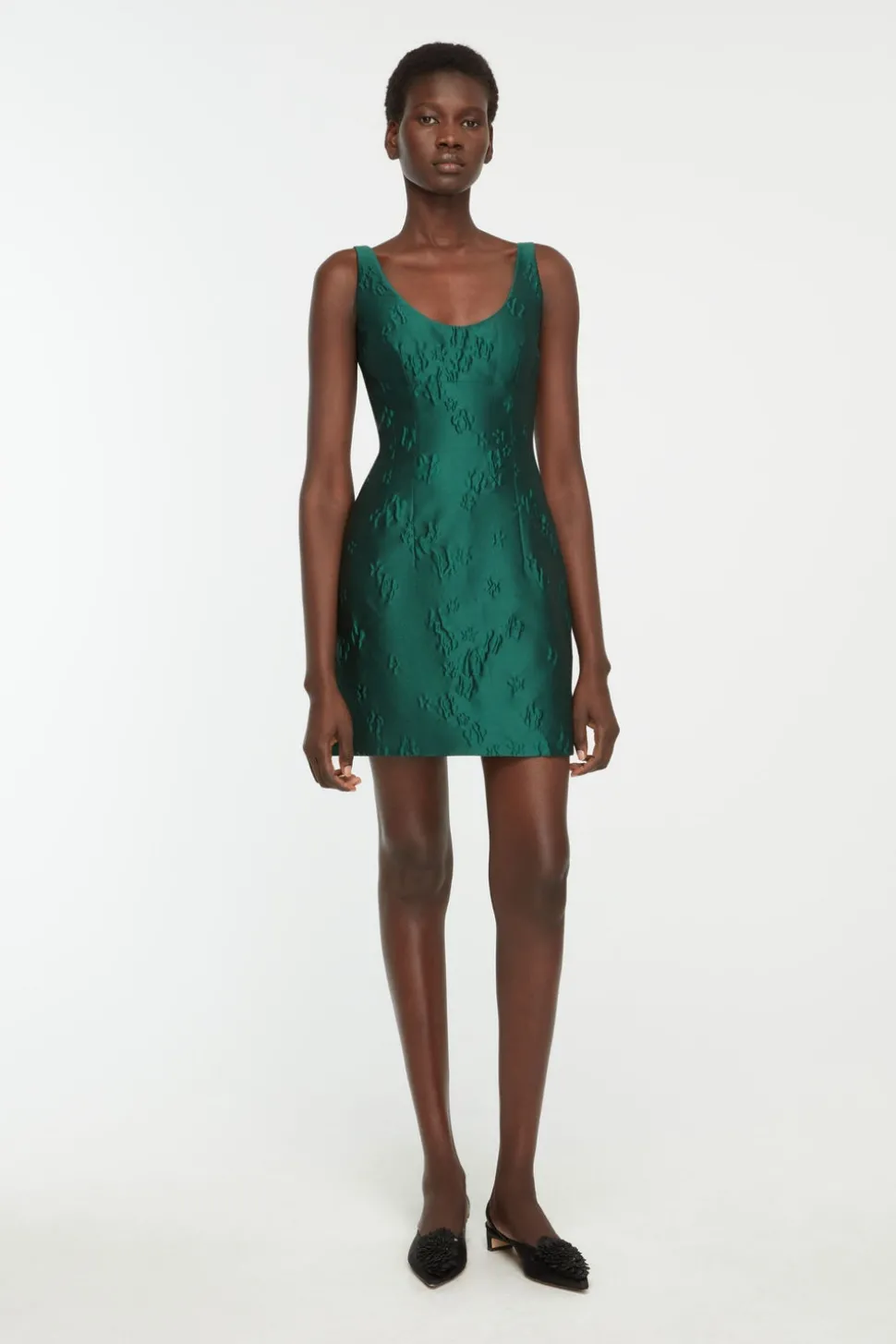 Emilia Wickstead is the epitome of modern femininity. Established in the U.K. in 2008, the ready-to-wear designer is known for impeccable tailoring, bold color, and timeless quality. The Einna Mini Dress in in Emerald Green Ditsy Floral Jacquard is woven with an elegant rose motif in a sophisticated shade of green. Featuring a wide-set neckline and fitted bodice, the sculpted silhouette flares gracefully over the hips, creating a flattering hourglass shape—an elevated choice for festive occasions.