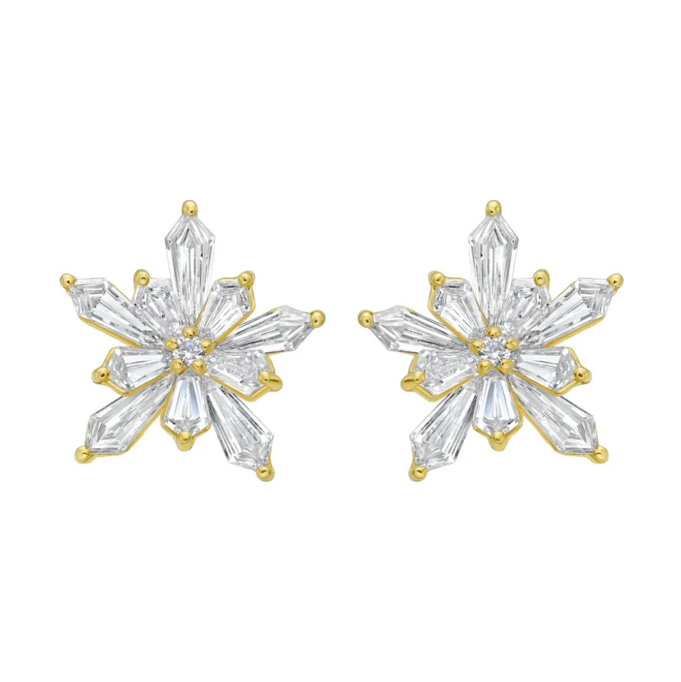 Luxury jewelry house, RUCHI New York, specializes in creating unique and versatile pieces that are exquisitely handmade and boast an heirloom quality. Crafted with precision in a variety of metals, each piece by this brand is designed to be cherished as a symbol of enduring love, whether it’s a stunning diamond ring or a timeless necklace. The Elia Diamond Stud Earrings feature kite-shaped diamonds in a delicate snowflake motif, centered around a brilliant-cut stone for a sparkling, standout finish.
