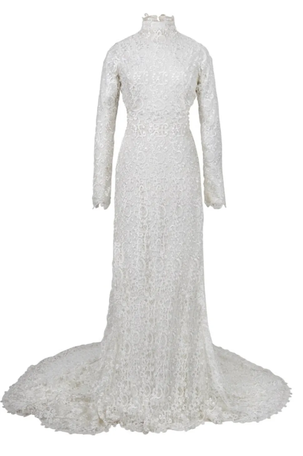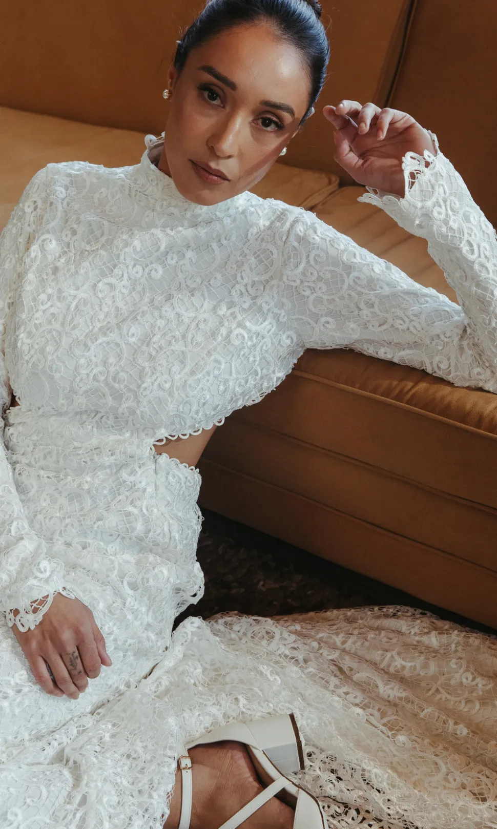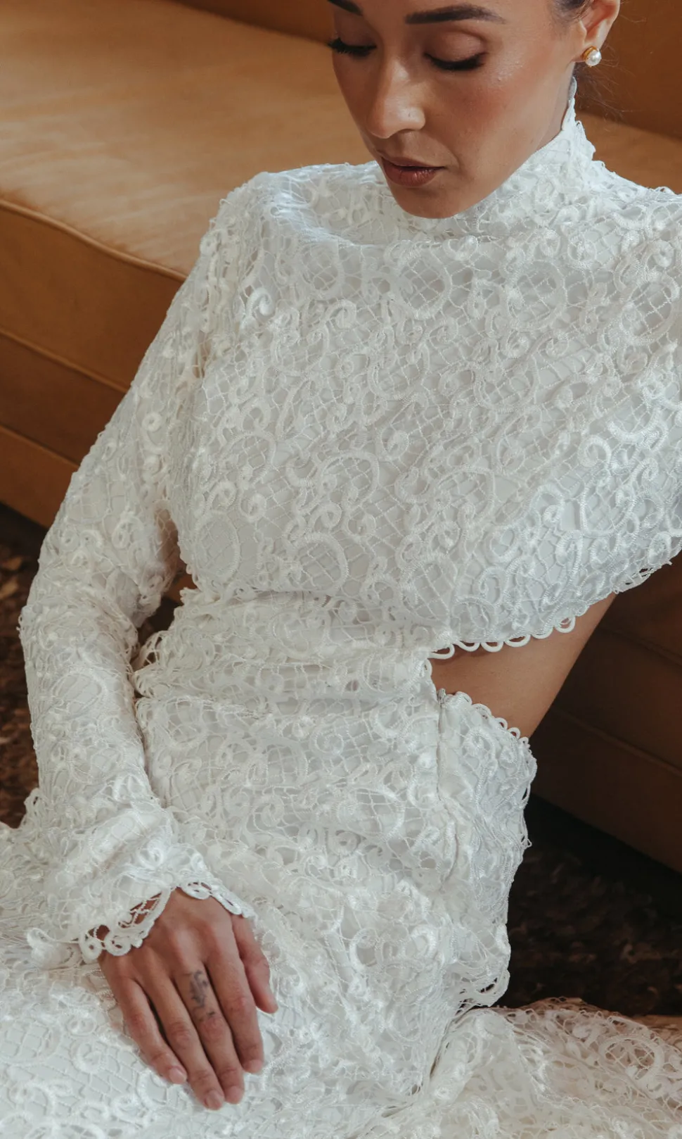 Nestled in California’s San Joaquin Valley, Daughters of Simone draws inspiration from American themes and culture, specializing in bridal wear and suits. The silhouettes evoke a blend of Victorian and Western influences, infused with the free-spirited essence of the 1970s. The Elia Long Sleeve Open Back Lace Wedding Dress boasts an ivory high neck guipure, lace long sleeves with a slight bell at the sleeve, and side cut outs with an open back.
