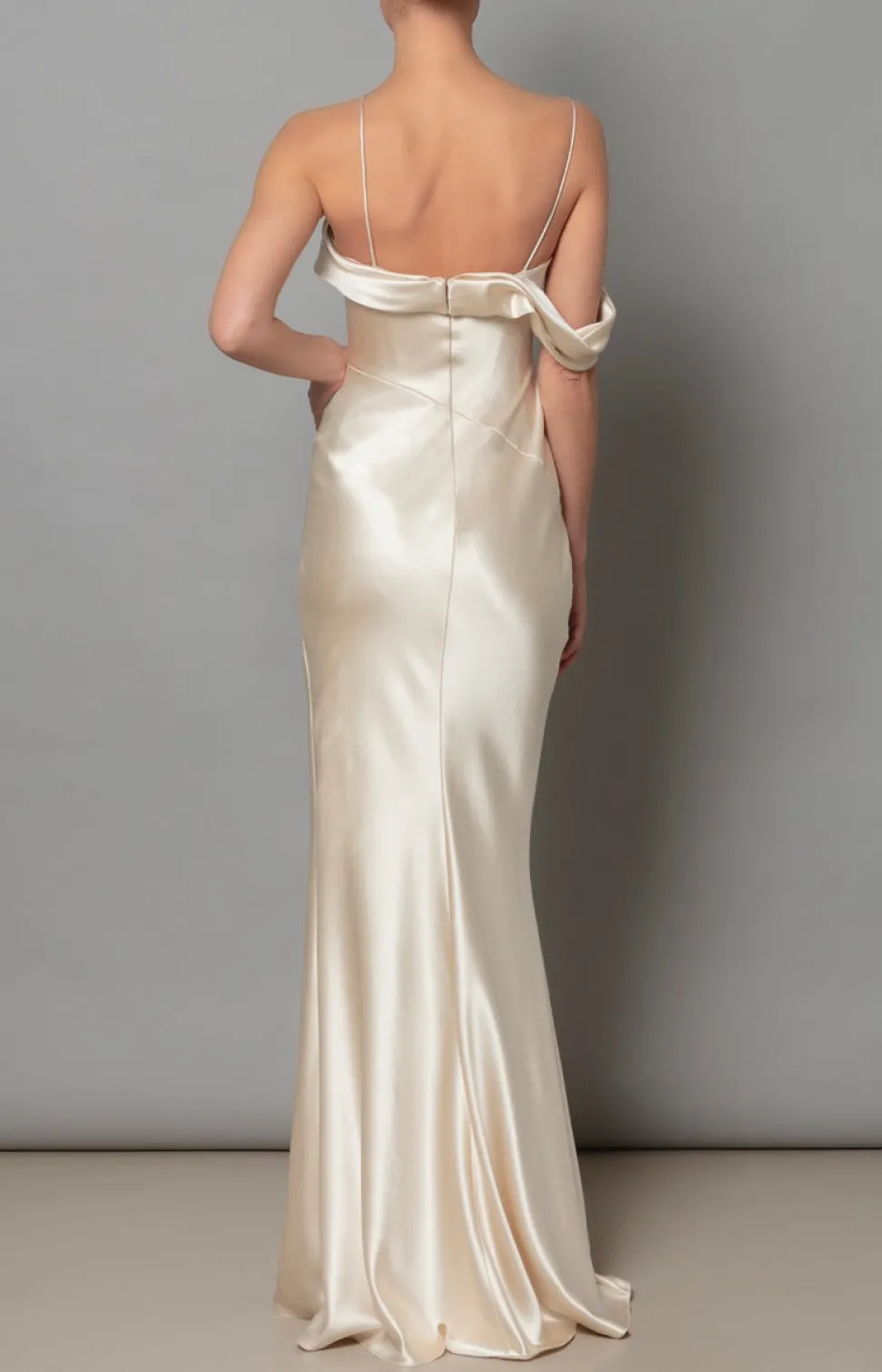 At Galia Lahav, high-end fabrications, meticulous sewing techniques, and a unique vision result in lavish dresses and ornate designs treasured by women worldwide. The Prêt-à-Porter collections are designed in London and offer contemporary, tailored, and edgy designs with the same sensual tone of Galia Lahav Couture. Cut on the bias and boasting a shawl neckline, we cannot help but fall for the Elise Dress in Champagne’s sophistication, especially with its diagonal front split skirt.