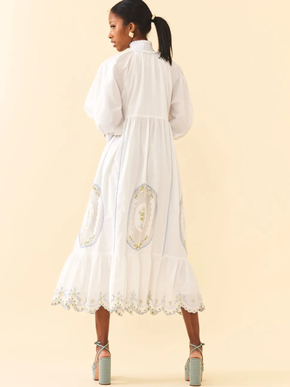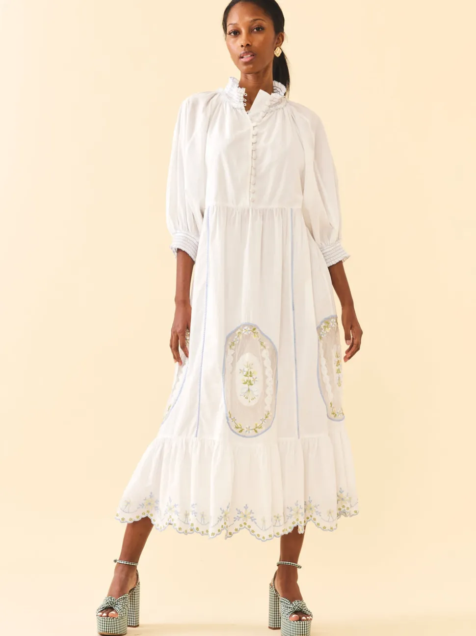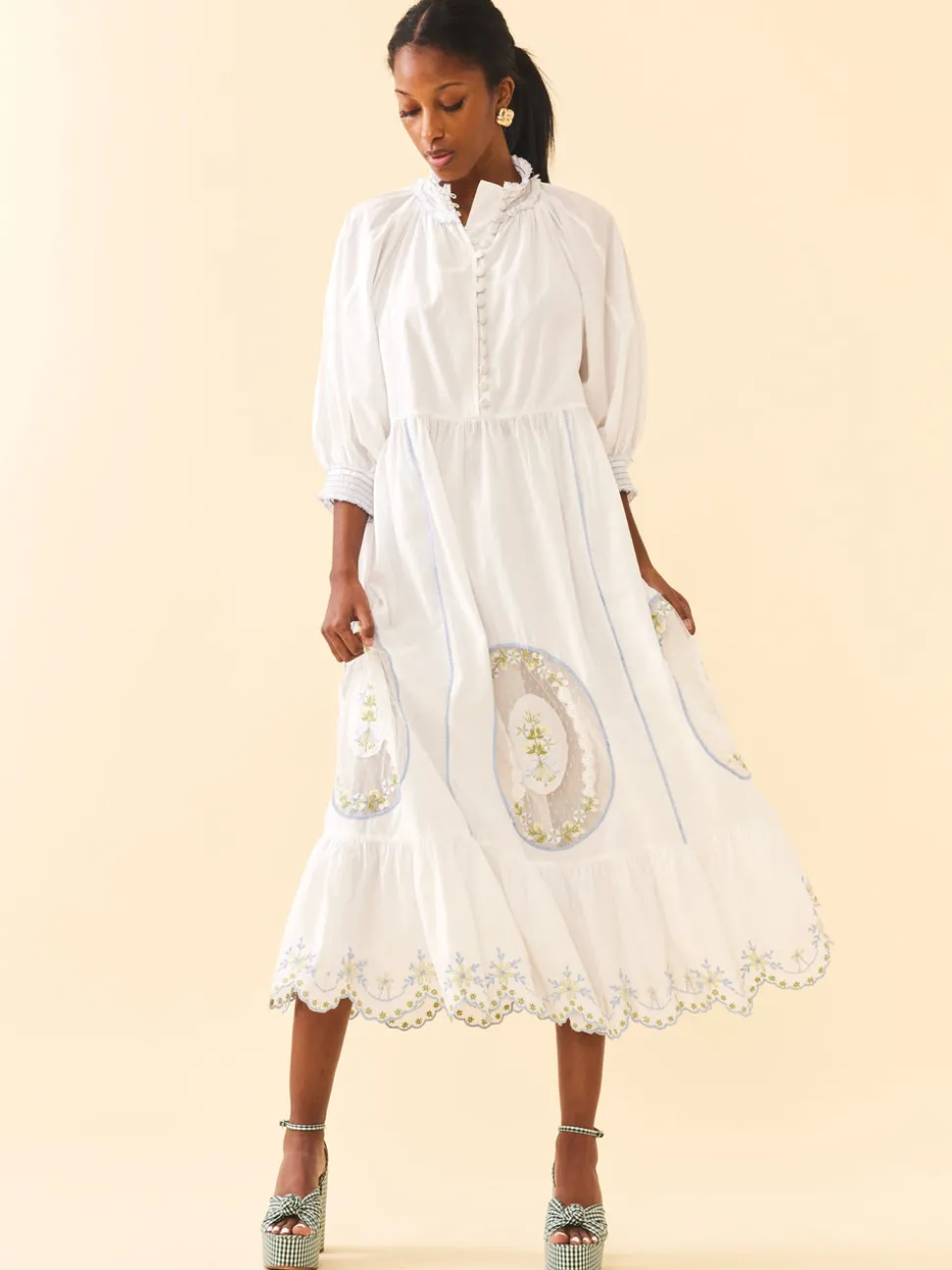Tomboy looks, girly-girl styles, and an always fashionable approach define Eddy’s aesthetic. With a focus on bold and feminine silhouettes, Eddy dresses and tops pair elevated California bohemian with global inspiration; these are clothes designed to make you feel good inside and out. Crafted in 100% cotton, the Eliza Maxi in White Whimsy is detailed with sheer white lace mesh that is finished with a combination of embroidery and lace trim details. Floral Embroidery details offering eye-catching design details that stand out against the soft white. Easy fit dress that flows over your body. Smocking details at the necklace as well as the elbow sleeve, fabric covered buttons that offer coverage options. Finished with a pleated ruffle.