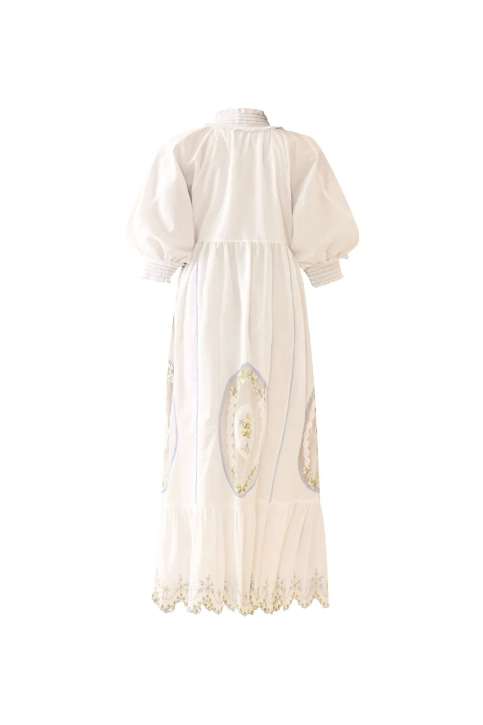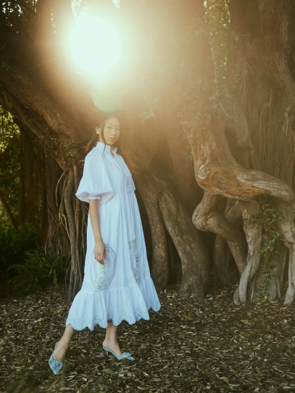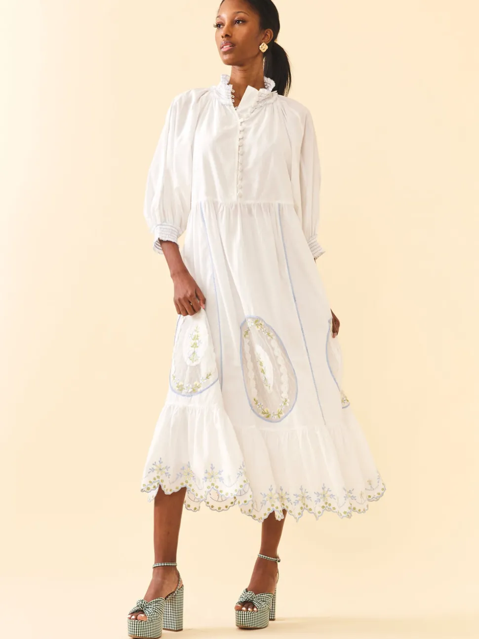 Tomboy looks, girly-girl styles, and an always fashionable approach define Eddy’s aesthetic. With a focus on bold and feminine silhouettes, Eddy dresses and tops pair elevated California bohemian with global inspiration; these are clothes designed to make you feel good inside and out. Crafted in 100% cotton, the Eliza Maxi in White Whimsy is detailed with sheer white lace mesh that is finished with a combination of embroidery and lace trim details. Floral Embroidery details offering eye-catching design details that stand out against the soft white. Easy fit dress that flows over your body. Smocking details at the necklace as well as the elbow sleeve, fabric covered buttons that offer coverage options. Finished with a pleated ruffle.