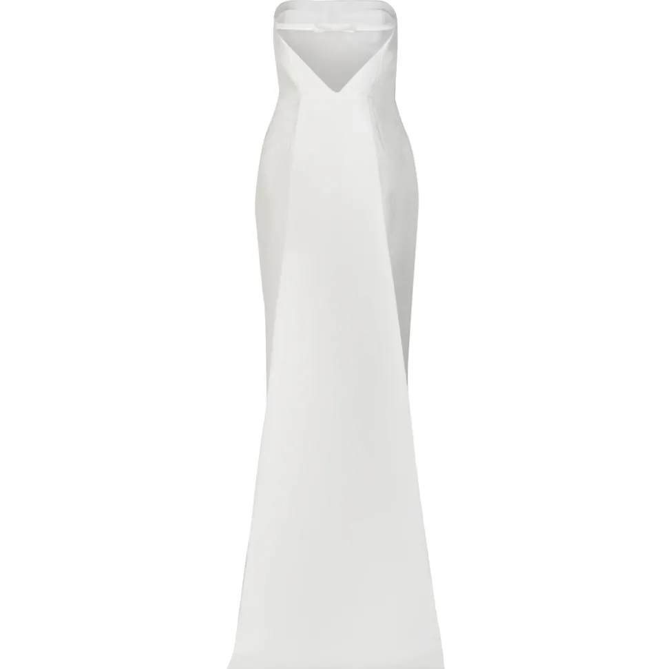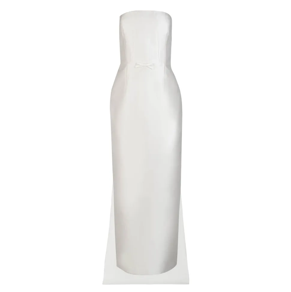 A graduate of the Savannah College of Design, award-winning Alexandra Pijut’s namesake line arrives from her studio in New York, offering luxe ready-to-wear pieces that distinguish themselves between femininity and practicality. With its sleek silhouette and romantic flourishes, the Elizabeth Dress in Ivory Mikado combines tailored structure with soft detailing. The slim column shape is balanced by a detachable train, while bow accents at the shoulder and waistline lend sculptural charm. Crafted in subtly lustrous mikado, it’s a refined choice for ceremonial occasions and beyond.
