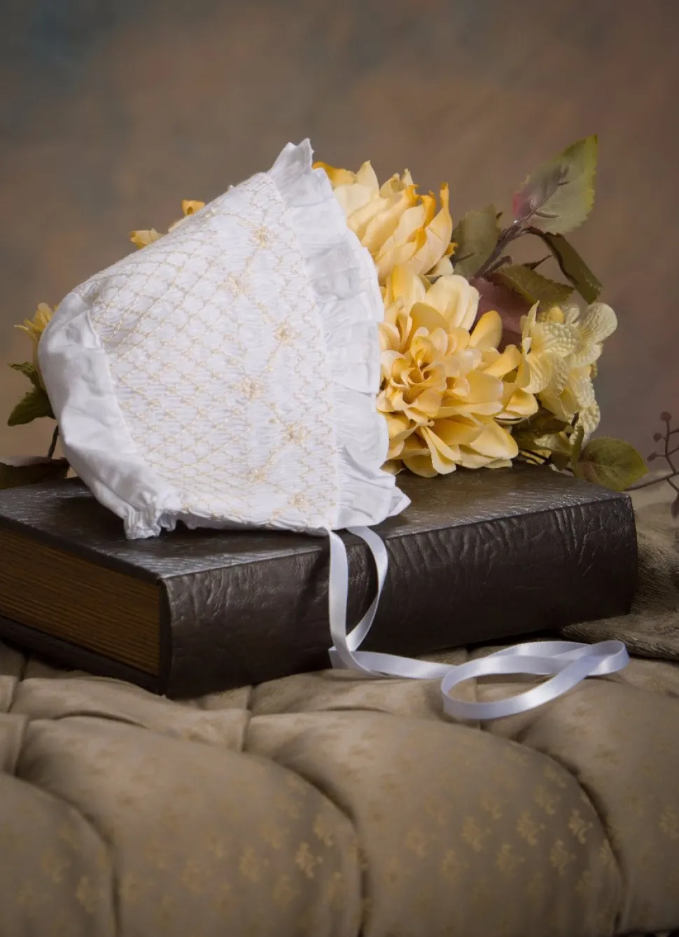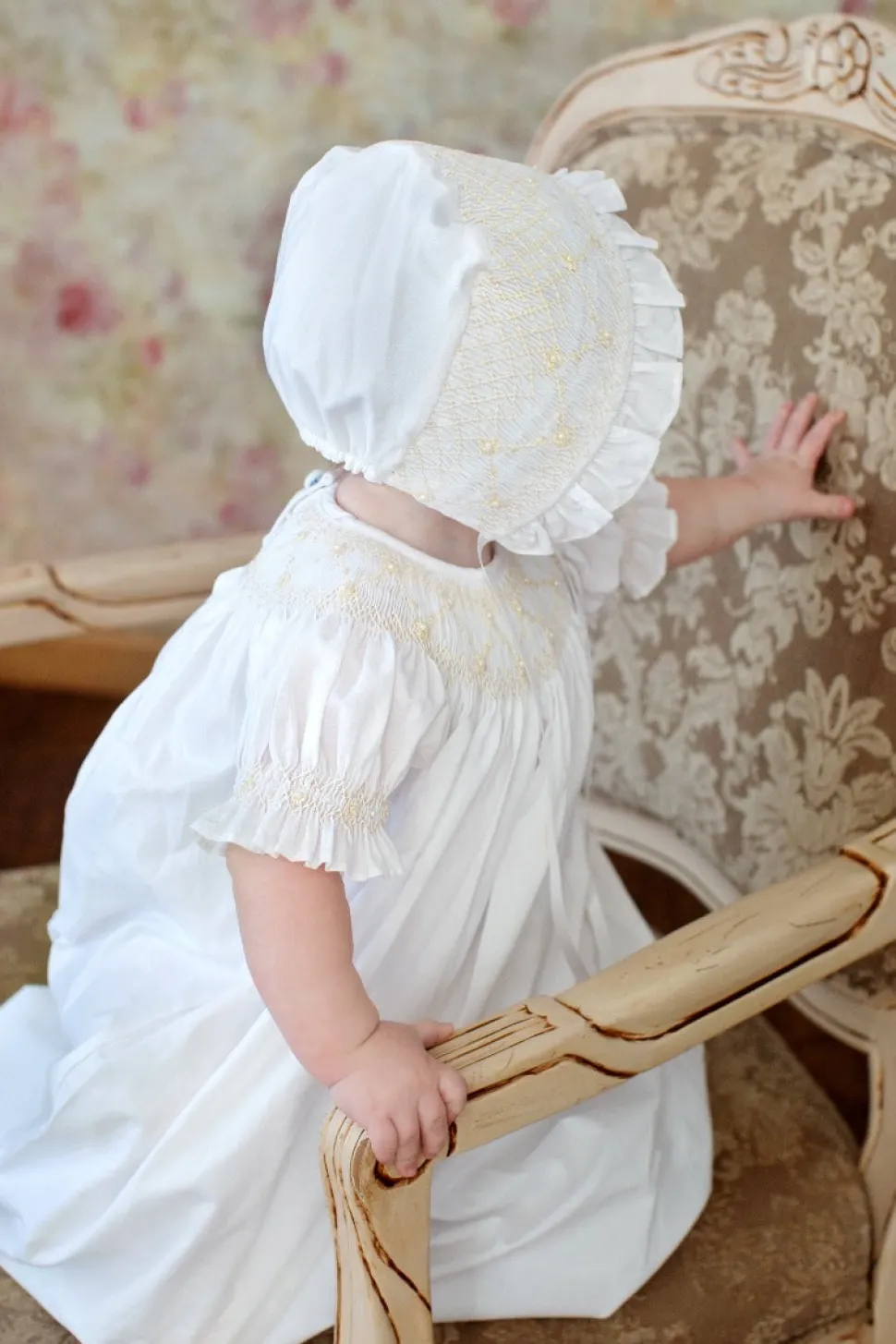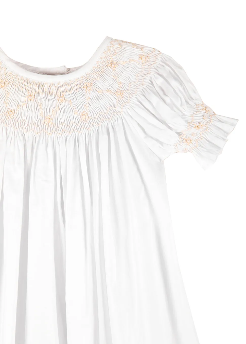 Using artisan seamstresses to craft small orders of their heirloom pieces, Strasburg Children pays special attention to details—French seams, built-in slips, and fabric-covered buttons—for lasting quality and comfort. Featuring an intricately hand-smocked neckline with ecru flowers and vines and smocked sleeve finishing in a ruffle, the Elizabeth Smocked Christening Gown is as classic and exquisite.