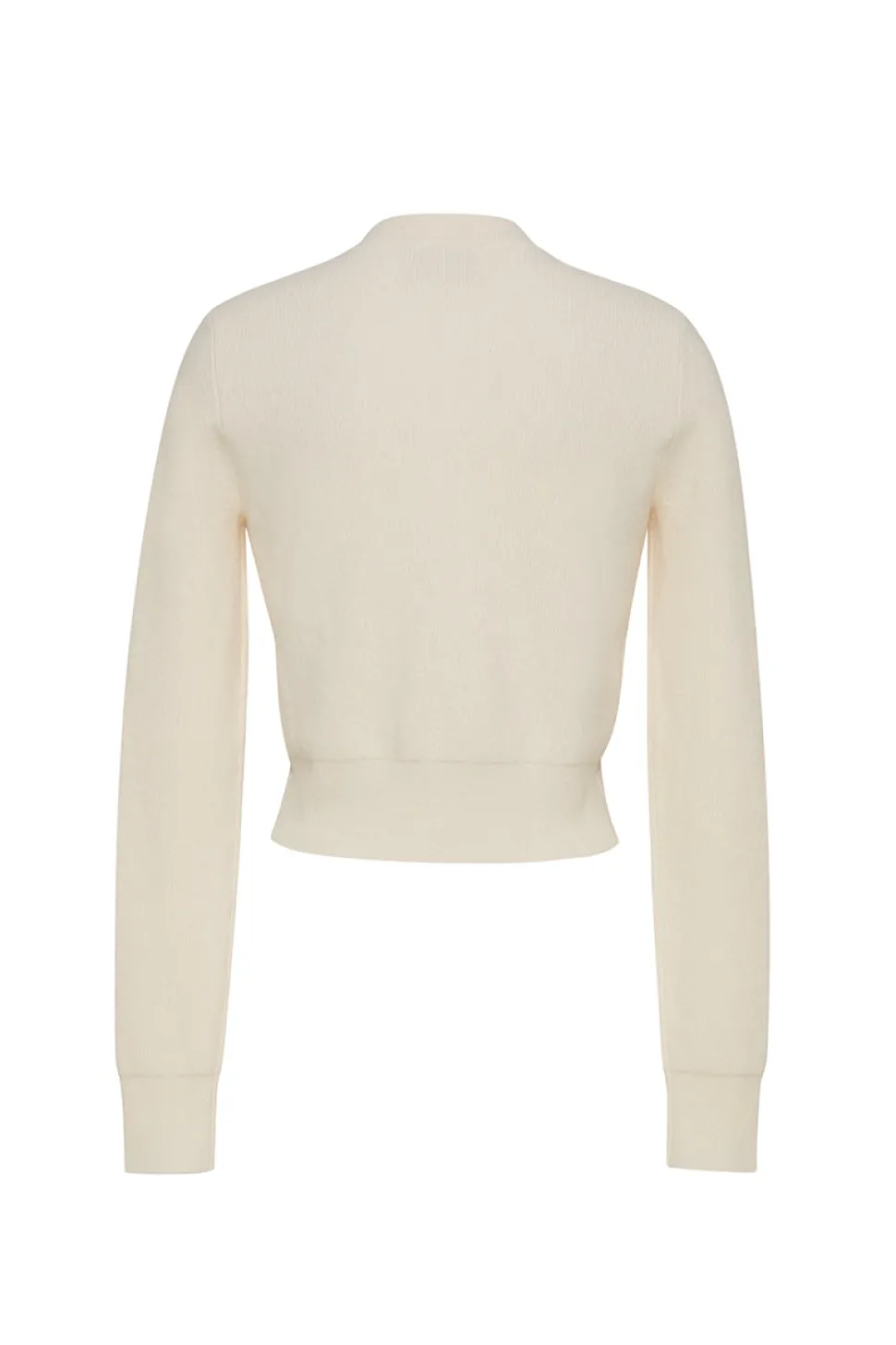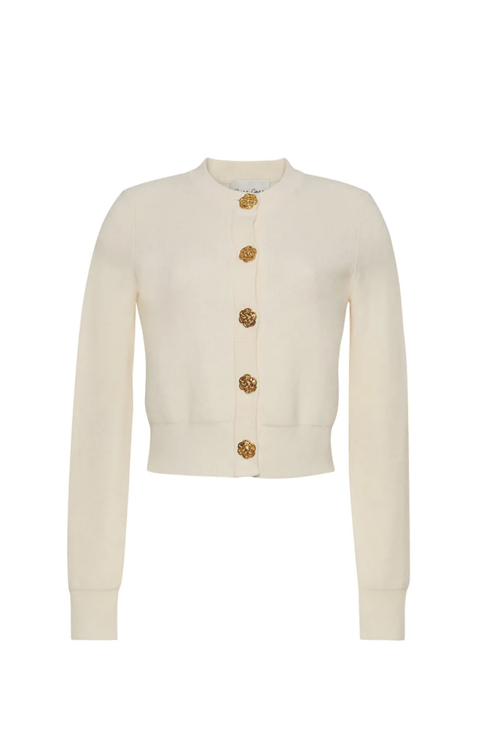 Crewneck fitted long-sleeve cardigan in White. Front button closure with gold floral novelty buttons. Ribbed cuffs and hem.