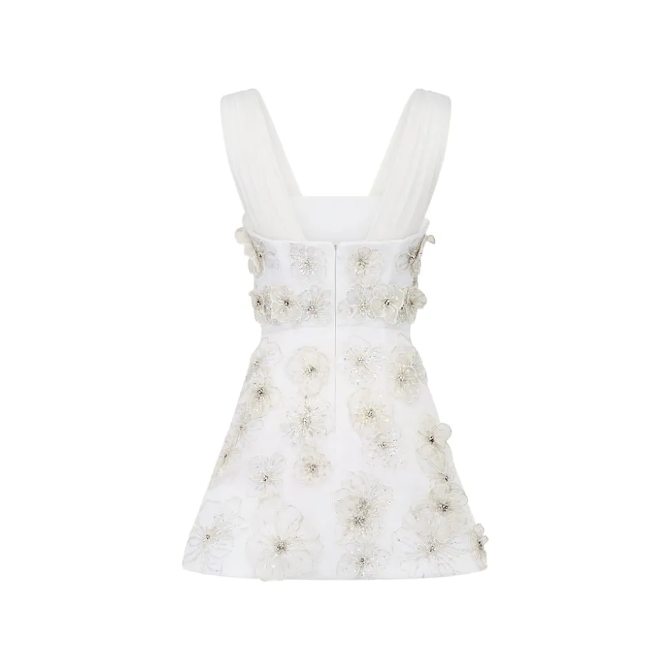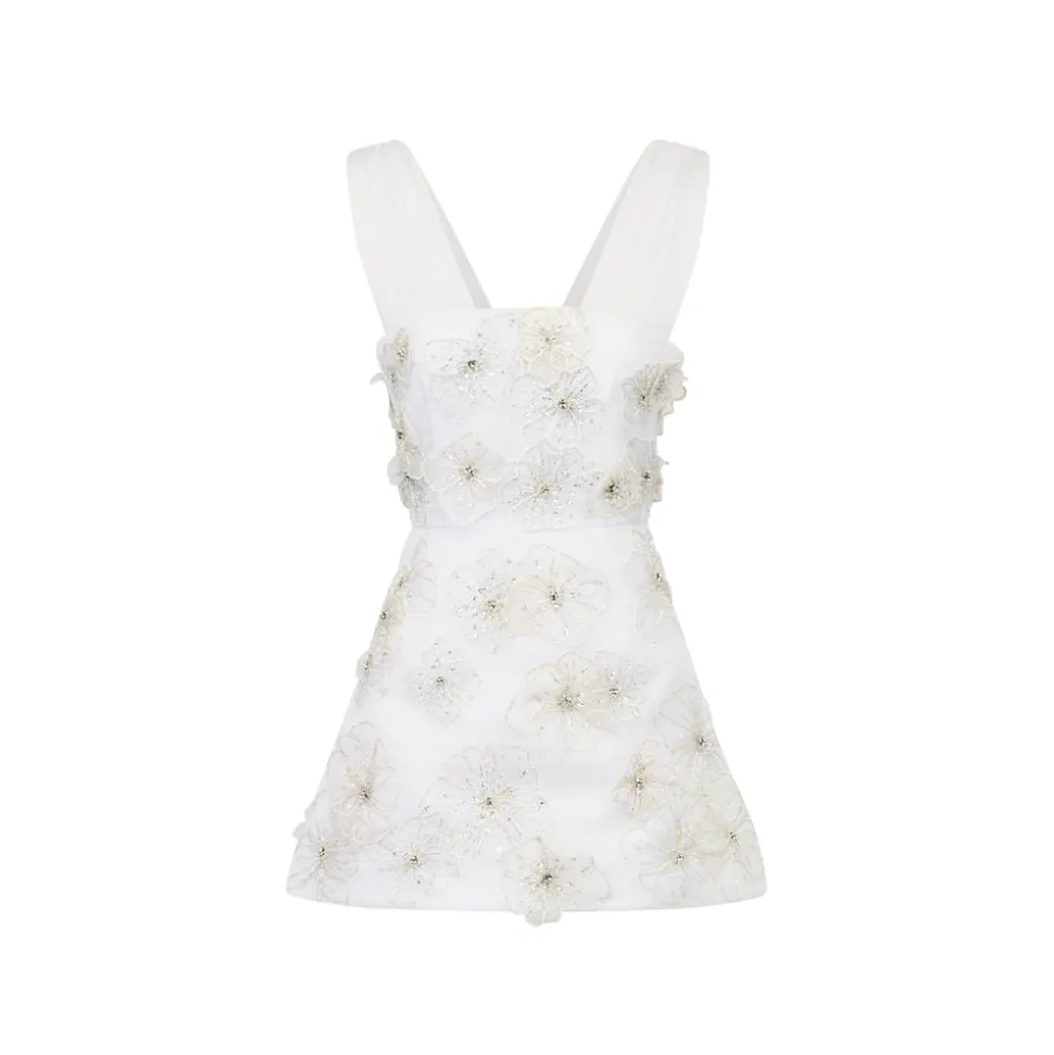 A graduate of the Savannah College of Design, award-winning Alexandra Pijut’s namesake line arrives from her studio in New York, offering luxe ready-to-wear pieces that distinguish themselves between femininity and practicality. The brand’s spring collection, “Picnic in Jaipur,” is inspired by the vibrant, maximalist colors and patterns of Villa Palladio. An ideal addition to any bridal trousseau, the Ellia Dress in White Organza with 3D Appliqué features delicate sleeves cut from crinkle chiffon and a structured, bell skirt; a modern modern silhouette with couture detailing.