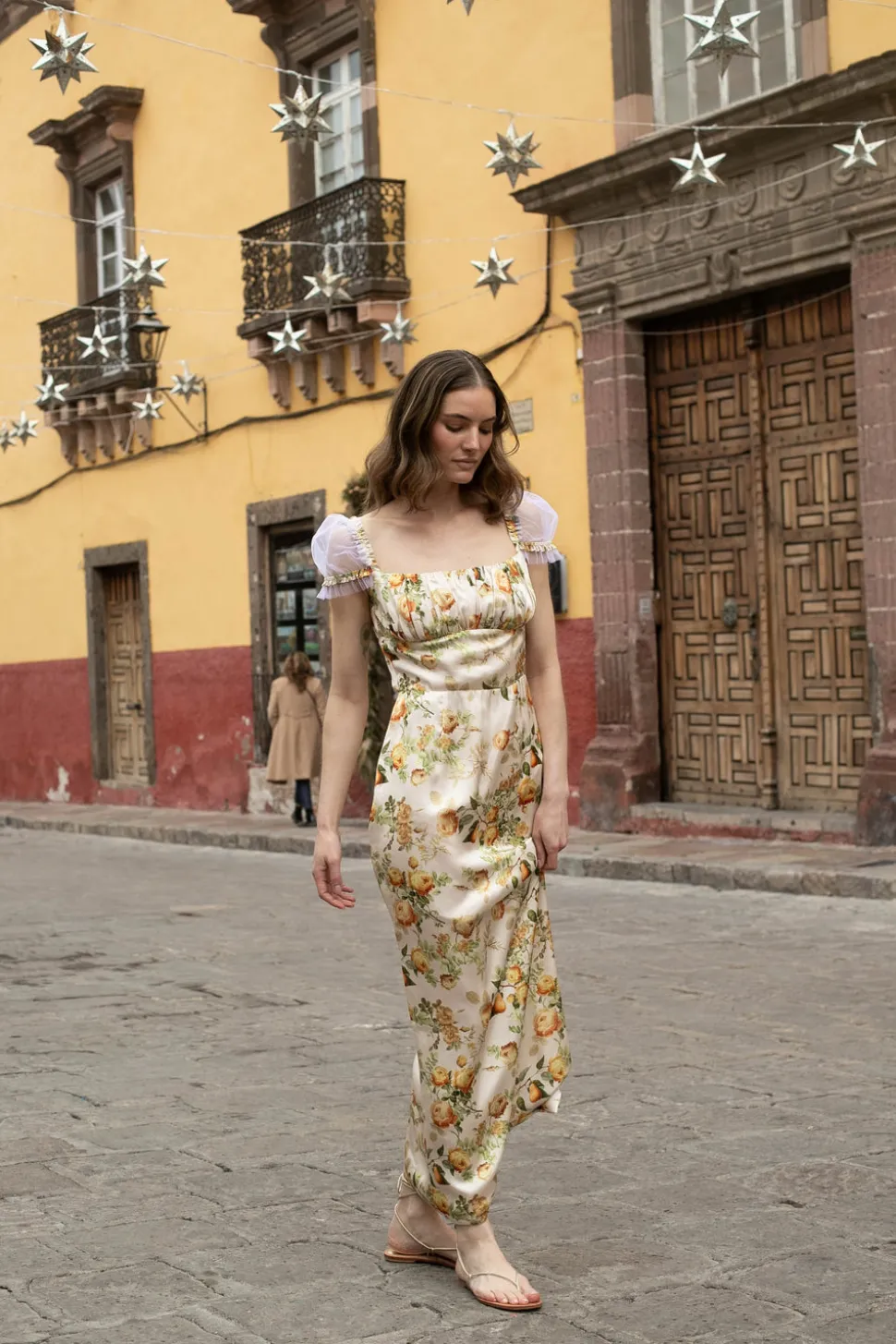 Silk pear-printed fabric. Ruched bodice. Square neckline. Sheer puff sleeves. Fitted waist. Straight ankle-length skirt. Back zip closure. Unlined.