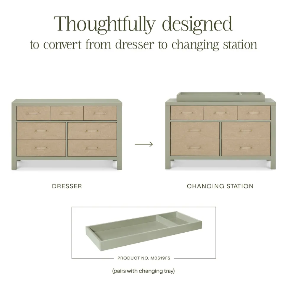Made to treasure, Namesake brings quiet sophistication to the nursery and beyond. Imbuing heirloom-quality craftsmanship with modern sensibility, these timeless essentials are made to be cherished for years to come. The Eloise 7-Drawer Assembled Dresser in French Sage and Performance Sand Eco-Weave balances soft, earthy tones with rich texture and sculptural detail. A tailored silhouette, fabric insets, and gleaming acrylic and gold hardware create a statement piece that offers generous storage and elegant longevity beyond the nursery.