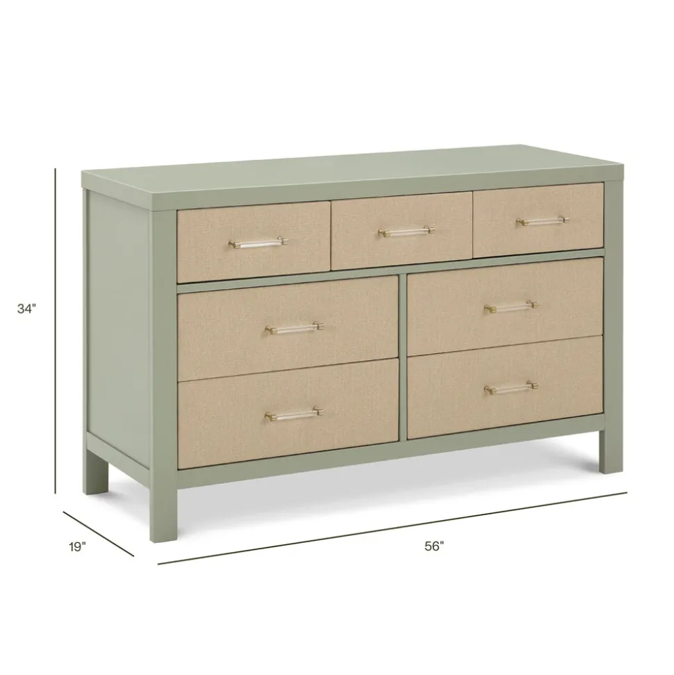 Crafted from sustainably sourced wood in a French sage finish with performance sand eco-weave fabric detailing. Features seven self-closing drawers with dovetail construction and acrylic-and-gold hardware. Designed to store clothing, linens, and everyday essentials. Arrives fully assembled. GREENGUARD Gold Certified.