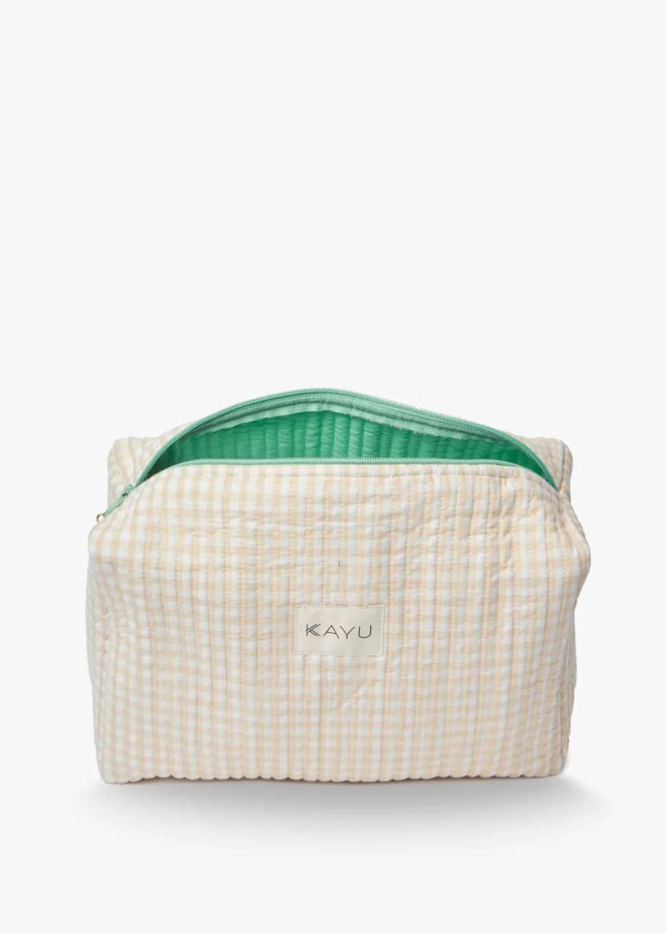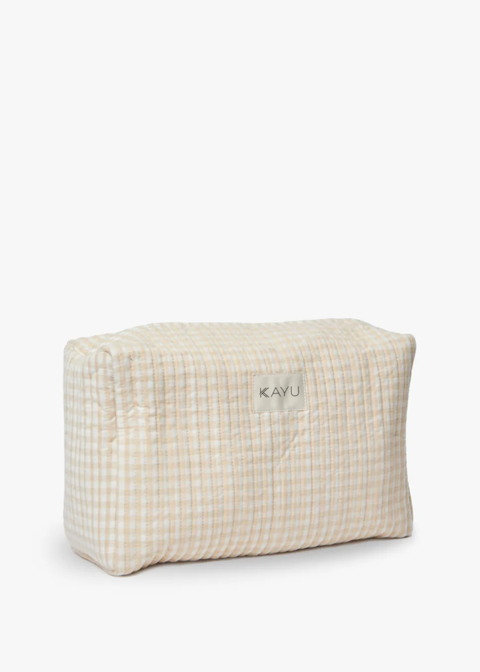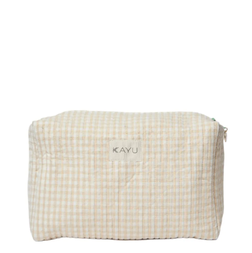 Designer Jamie Lim grew up in South East Asia, surrounded by the batik kaftans worn by her mother, and handmade rattan dining chairs. As she witnessed these artisanal goods be replaced by mass produced synthetics, Jamie created Kayu as a means to offer timeless personal and home accessories, made with the finest natural materials, and preserve indigenous craft. The Elsie Travel Case Zip Pouch Bag in Beige Gingham features contrasting piping, making these adorable pouches the ideal place to stash your beauty essentials. The zip top with logo charm keeps your belongings secure.