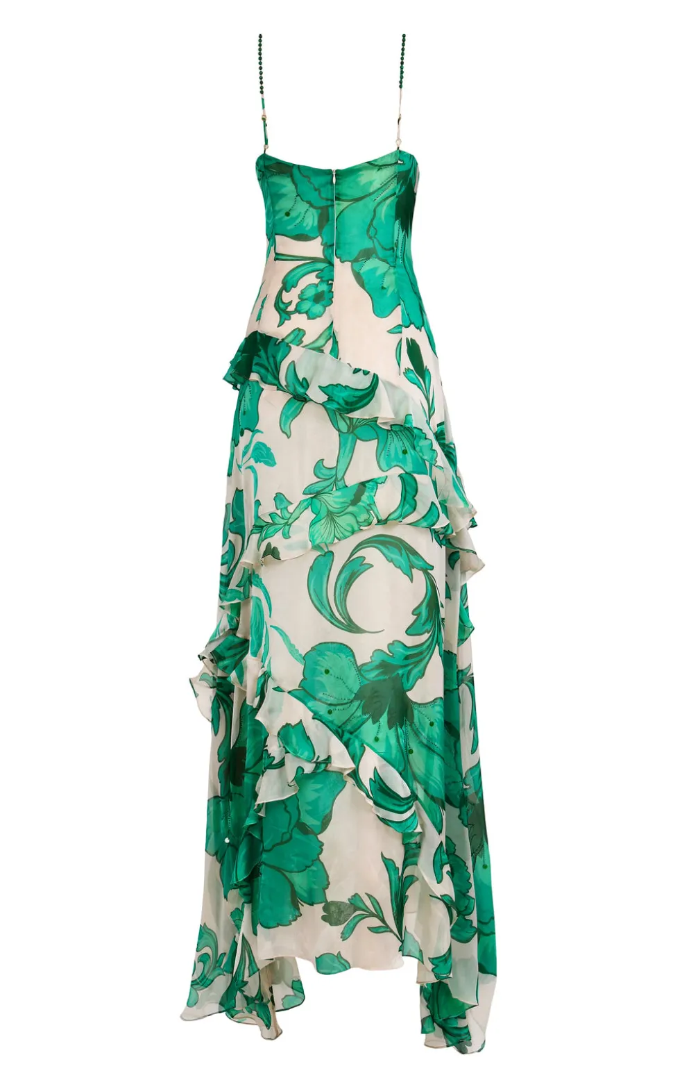 From her atelier in Barranquilla, Colombia, Francesca Miranda combines the diverse, indigenous aesthetic of her surroundings, as well as her own European roots, to produce sumptuous womenswear, bridal, and household objects, each bearing the essential spirit of artistry and craftsmanship. The Elysium Dress captures a sense of effortless romance, defined by softly cascading ruffles and a fluid silhouette. Cut in sheer printed silk with bold florals, it balances graceful movement with a fresh, modern energy.