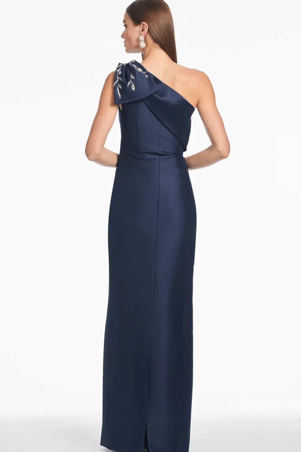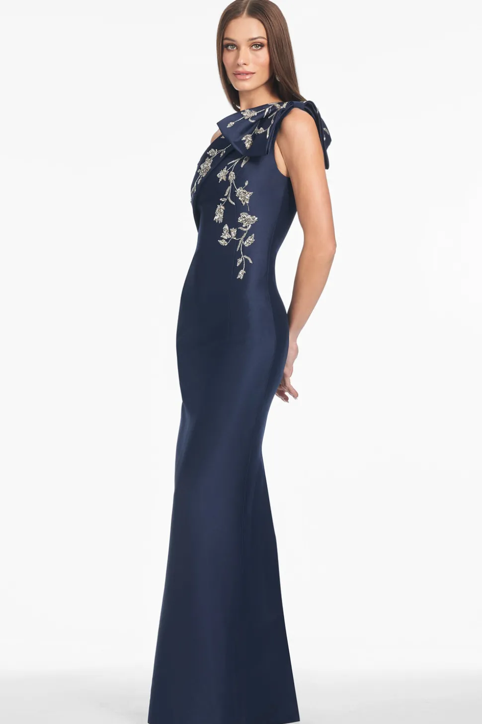 Born in India, Sachin and Babi bonded at New York’s Fashion Institute of Technology and launched an embroidery business, working with top houses, like Oscar de la Renta, and Manolo Blahnik. Today, the brand works with their own factory in Mumbai, controlling quality at every stage, and producing womenswear that is at once unique, beautiful, and wearable. The Olivia Gown in Charcoal skims the figure with its one-shoulder silhouette. To add some intrigue, she has an ideally placed half bow up top, and is adorned with floral embellishment throughout the bodice.