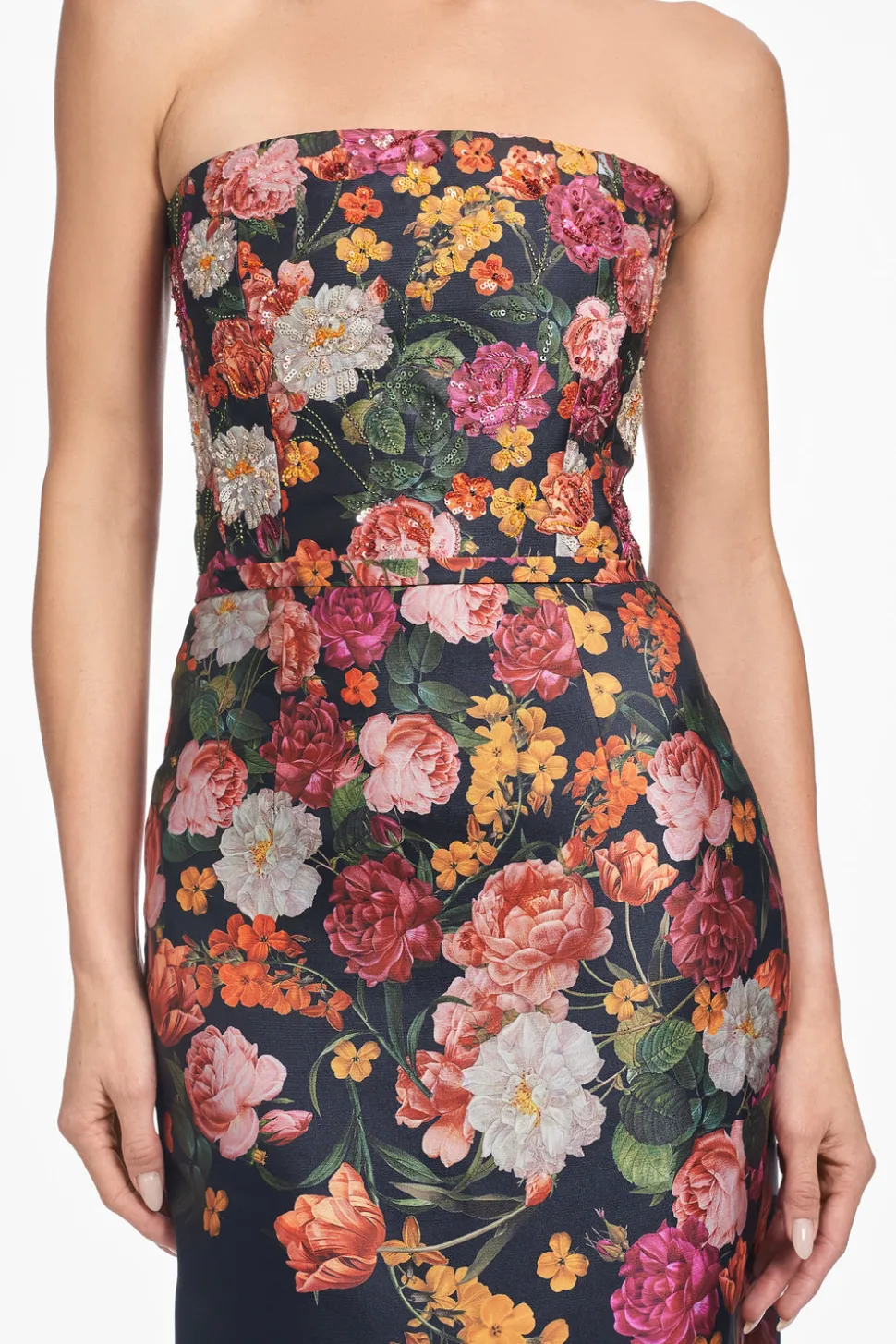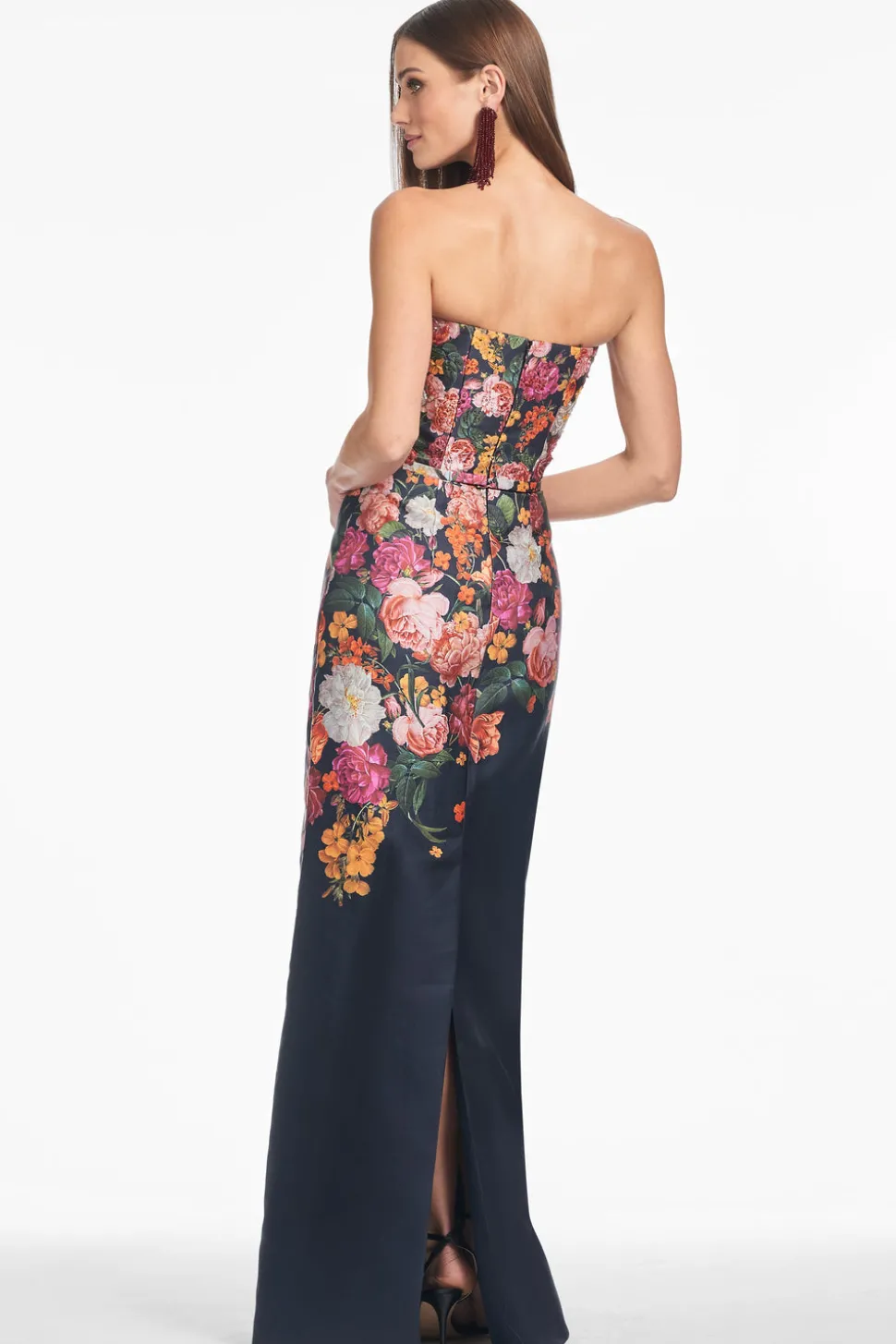 Born in India, Sachin and Babi bonded at New York’s Fashion Institute of Technology and launched an embroidery business, working with top houses, like Oscar de la Renta, and Manolo Blahnik. Today, the brand works with their own factory in Mumbai, controlling quality at every stage, and producing womenswear that is at once unique, beautiful, and wearable. At once elegant and artistic, the Embellished Sabine Gown Midnights Magic Blooms is a strapless column gown, defined by a sculpted silhouette and a complementary belt that cinches the waist at the slimmest point.