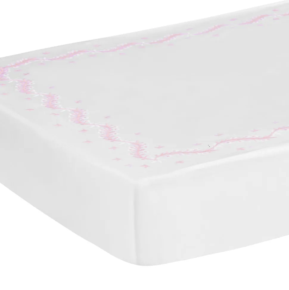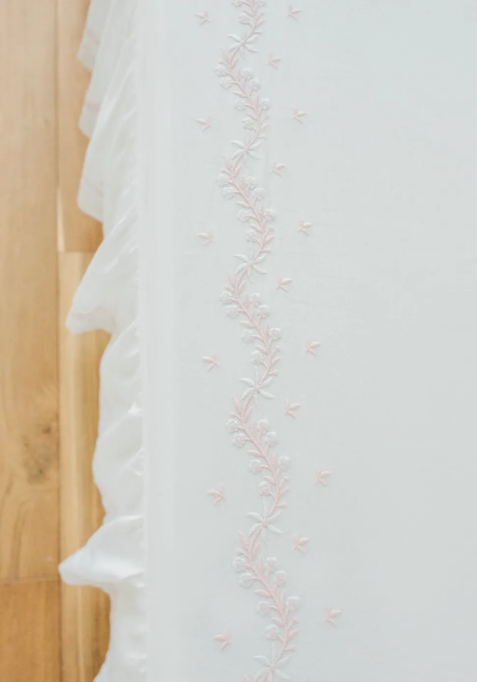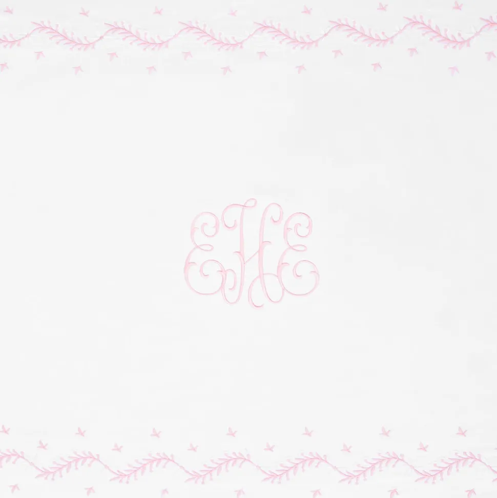 Shannon Latham founded Little English in 2004 with the belief that children should always be well-dressed. Employing hand-smocking, hand-embroidery, and the very best fabrics, Shannon and her daughter design timeless pieces that will be used for generations to come. The ideal finishing touch to any little one’s nursery, the Embroidered Crib Sheet in Blush features a crisp white cotton backdrop with light pink and white floral vines delicately embroidered along the edges. Pair with the matching Embroidered Crib Skirt, and add a monogram for an extra personal touch.