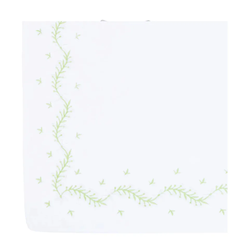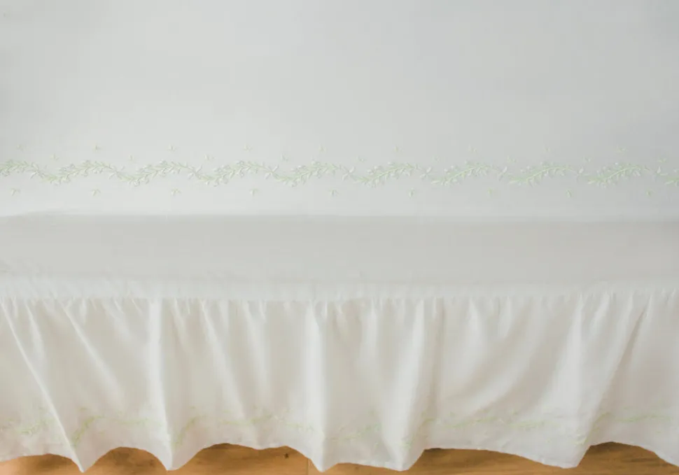 Shannon Latham founded Little English in 2004 with the belief that children should always be well-dressed. Employing hand-smocking, hand-embroidery, and the very best fabrics, Shannon and her daughter design timeless pieces that will be used for generations to come. The ideal finishing touch to any little one’s nursery, the Embroidered Crib Sheet in Meadow features a crisp white cotton backdrop with light green floral vines delicately embroidered along the edges. Pair with the matching Embroidered Crib Skirt, and add a monogram for an extra personal touch.